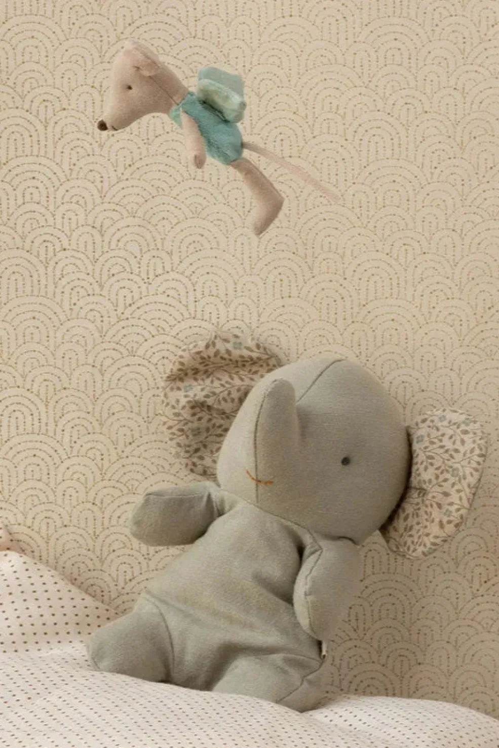Snoren på ryggen gør det muligt at hænge musen op. Den kan hænge i et børneværelse eller bruges til fantasifuld leg, hvor musen flyver.