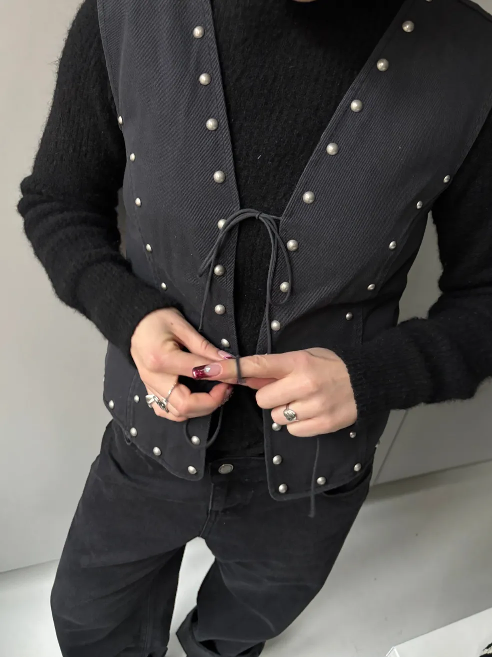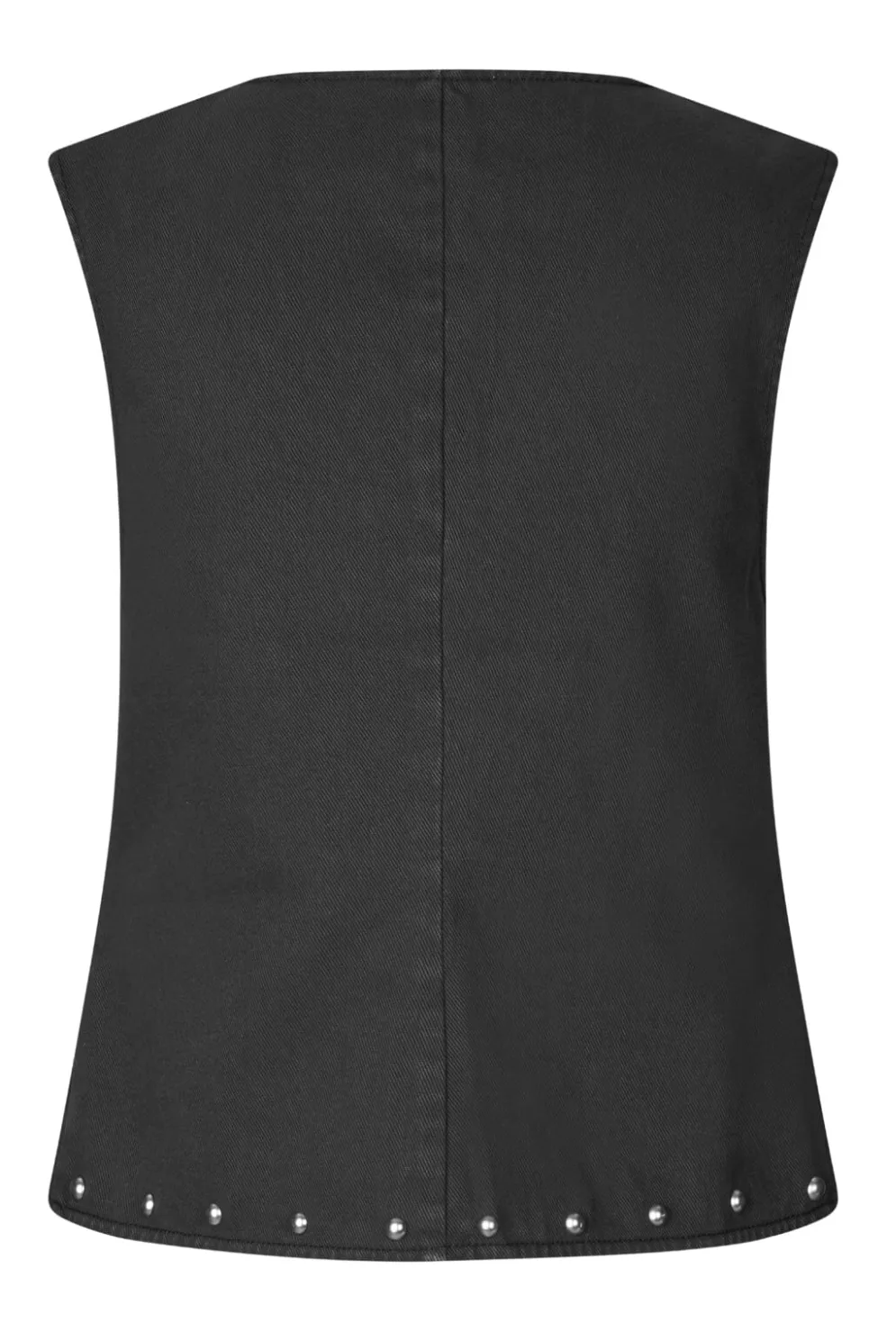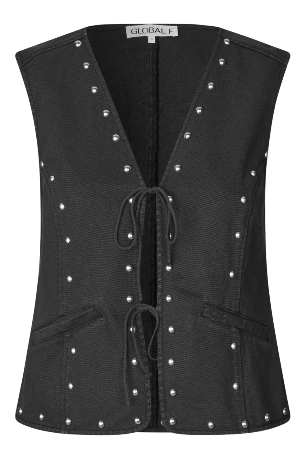 Ærmeløs vest fra Global Funk i vasket sort bomuld. Vesten har en V-udskæring, perledetaljer langs kanten og en snørelukning i midten. To praktiske lommer fuldender designet.