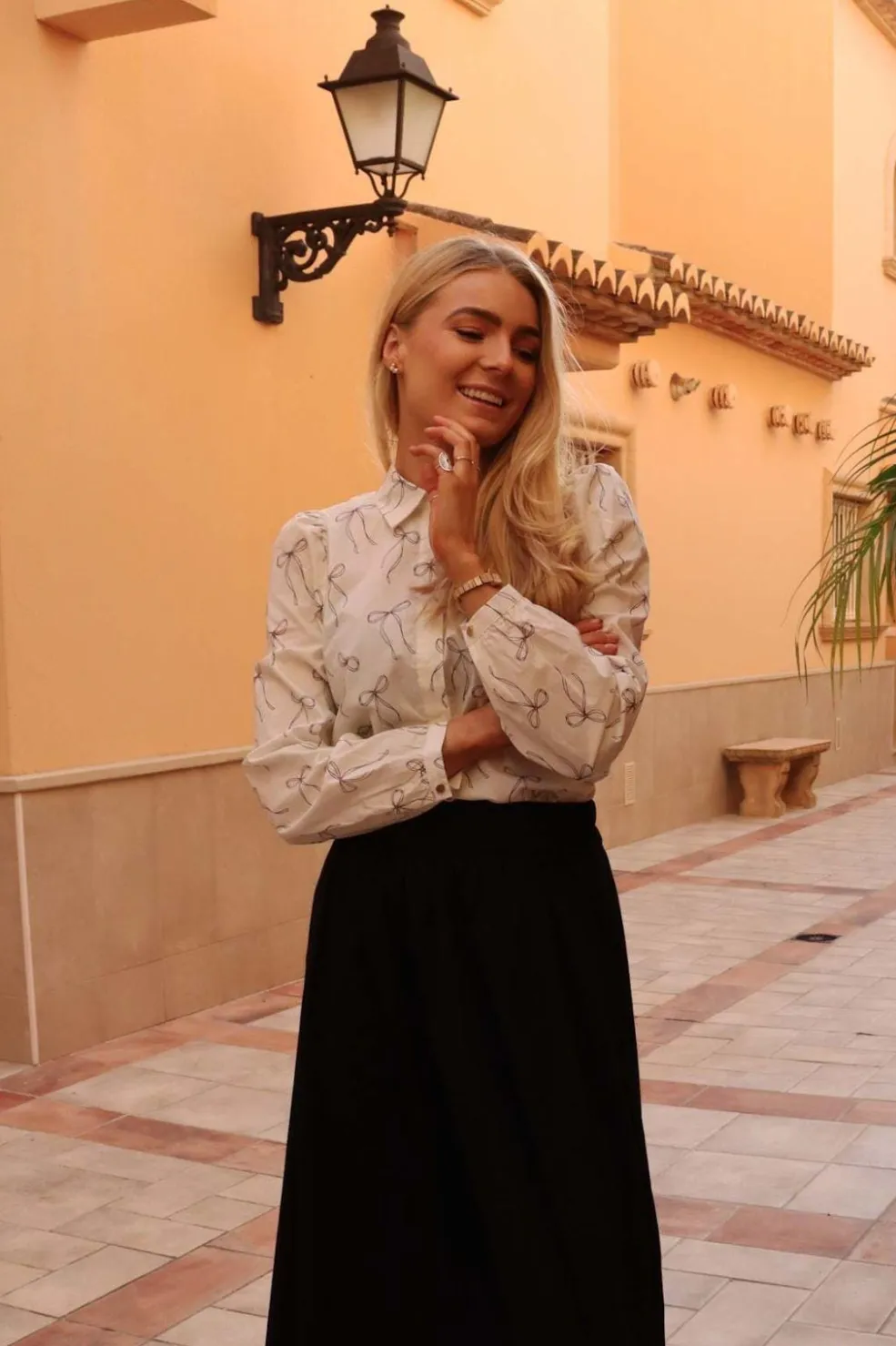 Cremefarvet bluse fra Liberte med et mønster af sorte sløjfer. Blusen har lange ærmer og en klassisk skjortekrave.
