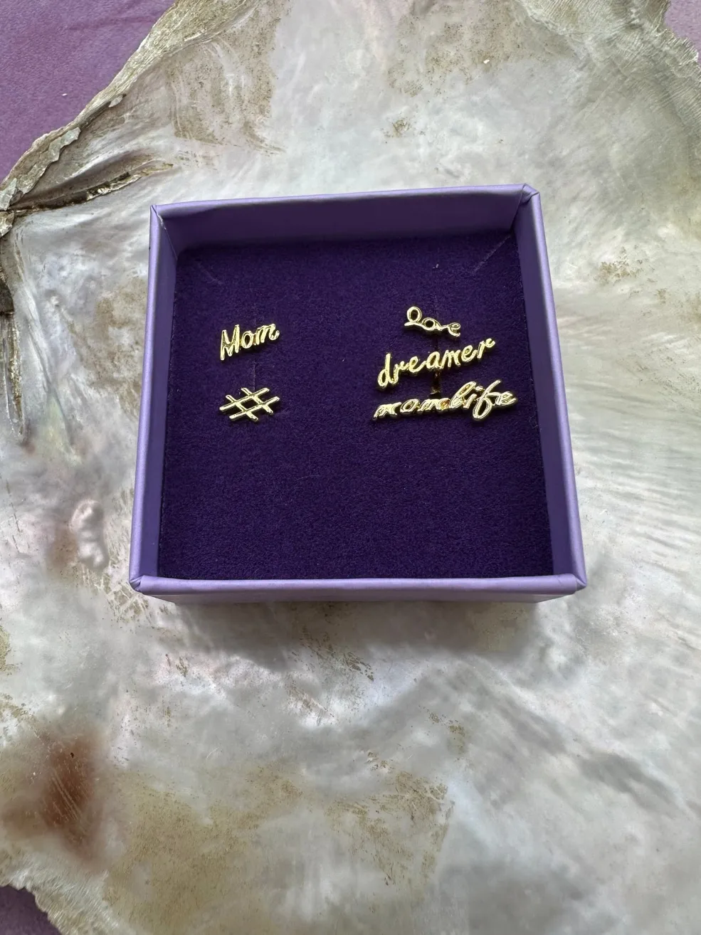 Forgyldt ørering fra Mellow Moon med teksten love. Øreringen har en fin detalje i form af skriften, der er udført i 18 karat forgyldt messing.