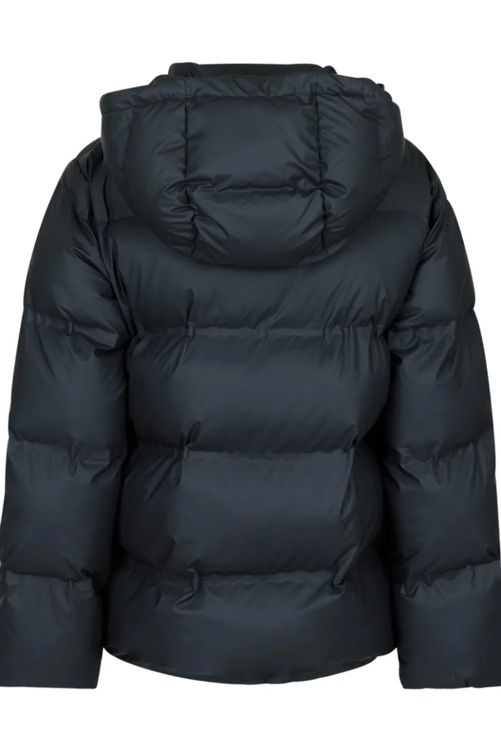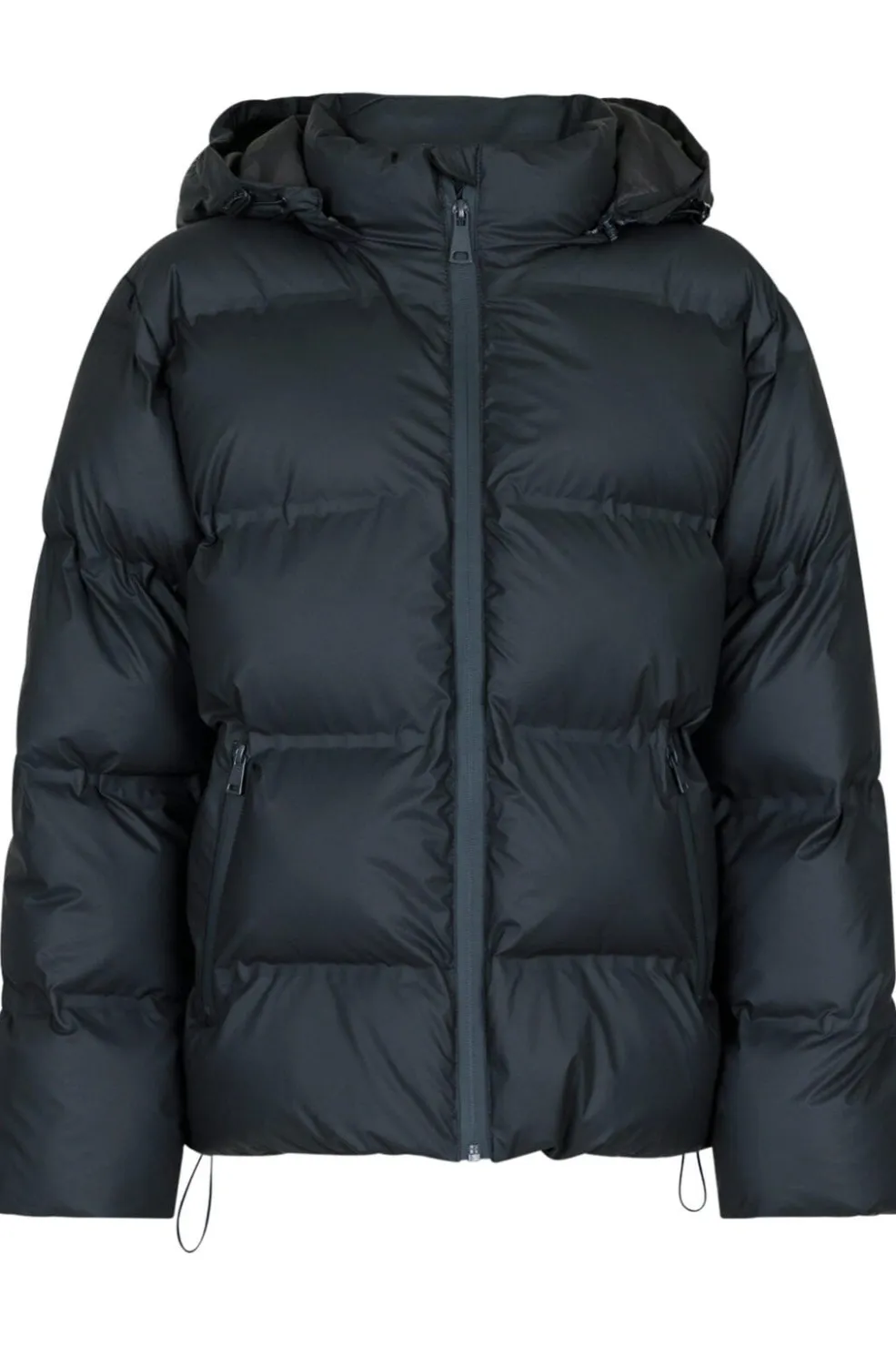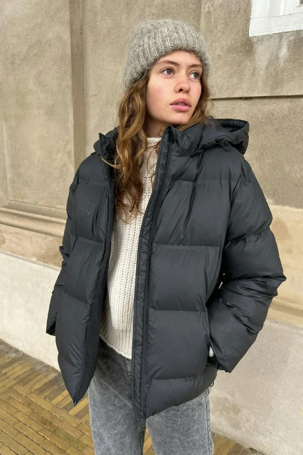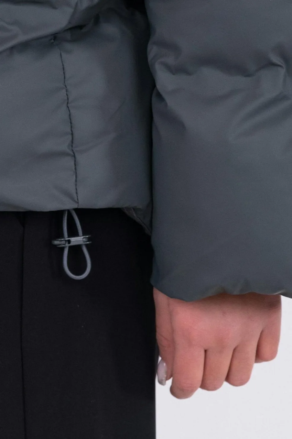 Pufferjakke fra Neo Noir i antracit med vandtæt materiale og et vandsøjletryk på 10.000 mm. En kort jakke med aftagelig hætte og høj hals.