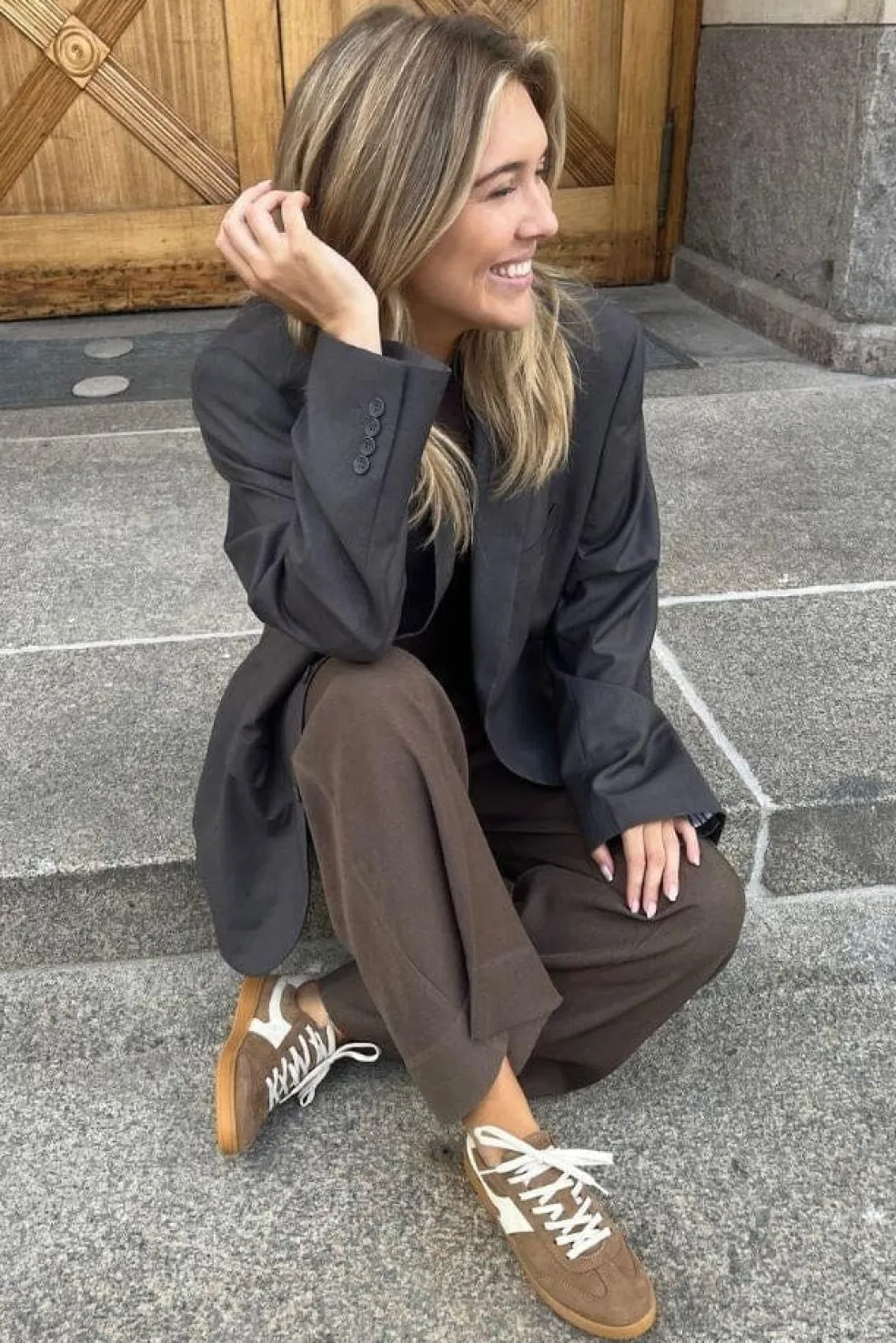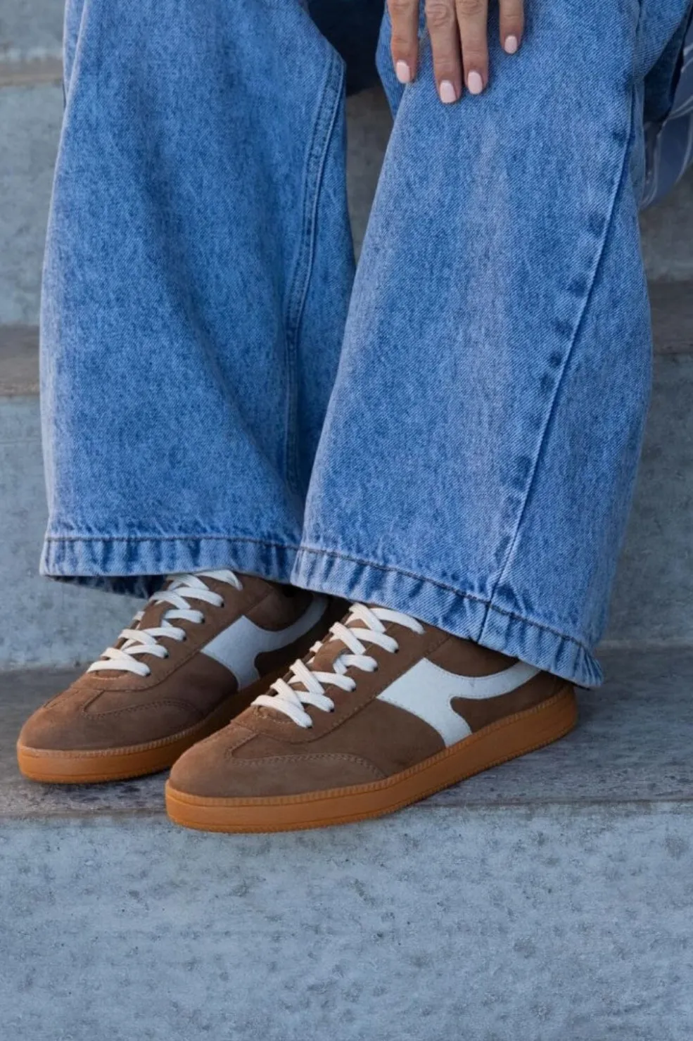 Sneakers fra Copenhagen Shoes i ruskind med en neutral taupe-farve. Skoene har hvide detaljer og en gummisål, der giver et afslappet og praktisk look.