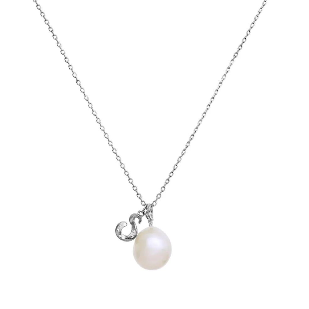 Vedhæng fra Maanesten med en stor, rund ferskvandsperle i hvid og en lille halvmånedetalje i genanvendt sterlingsølv. Vedhænget er designet til at hænge på en kæde.
