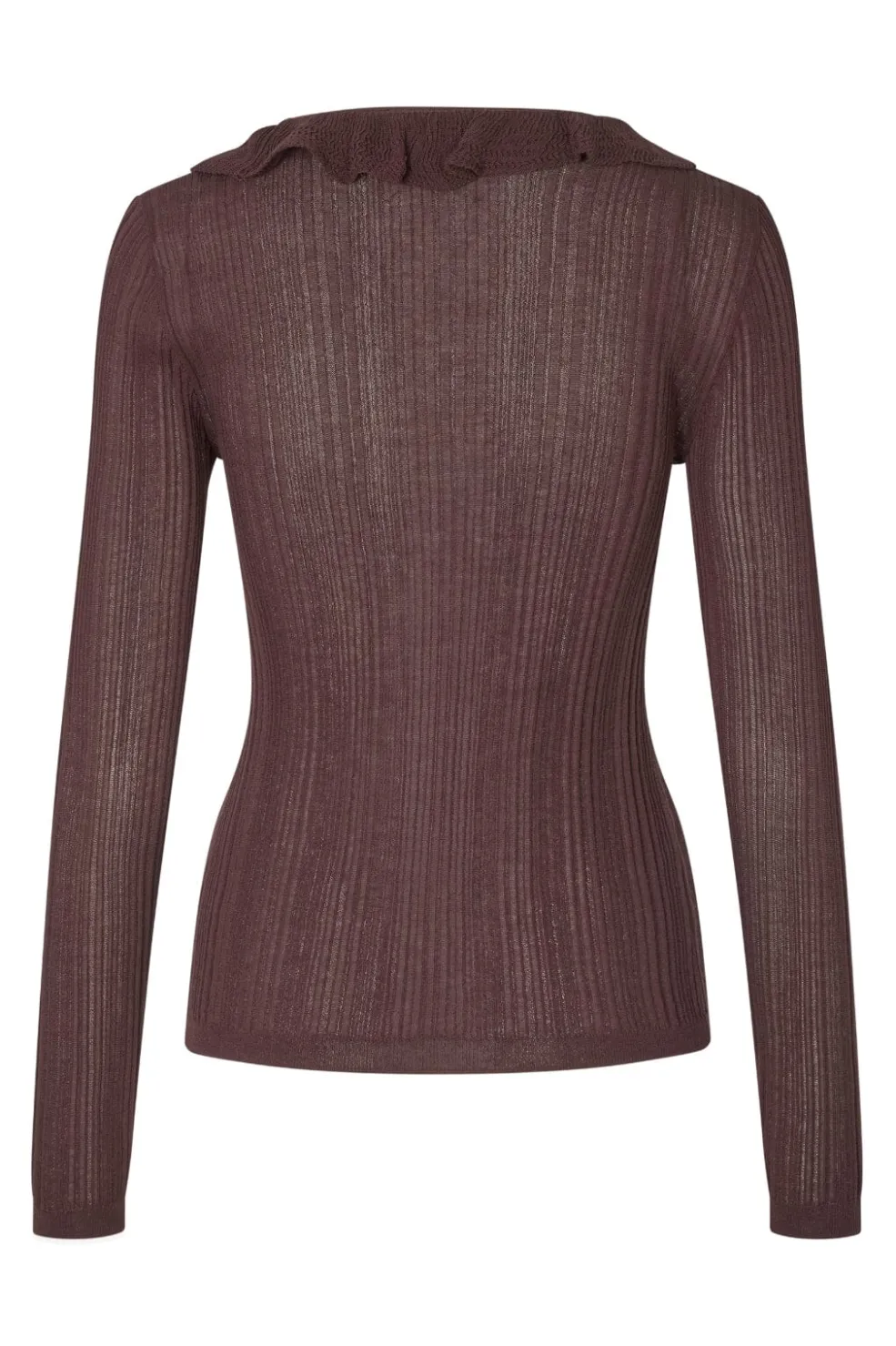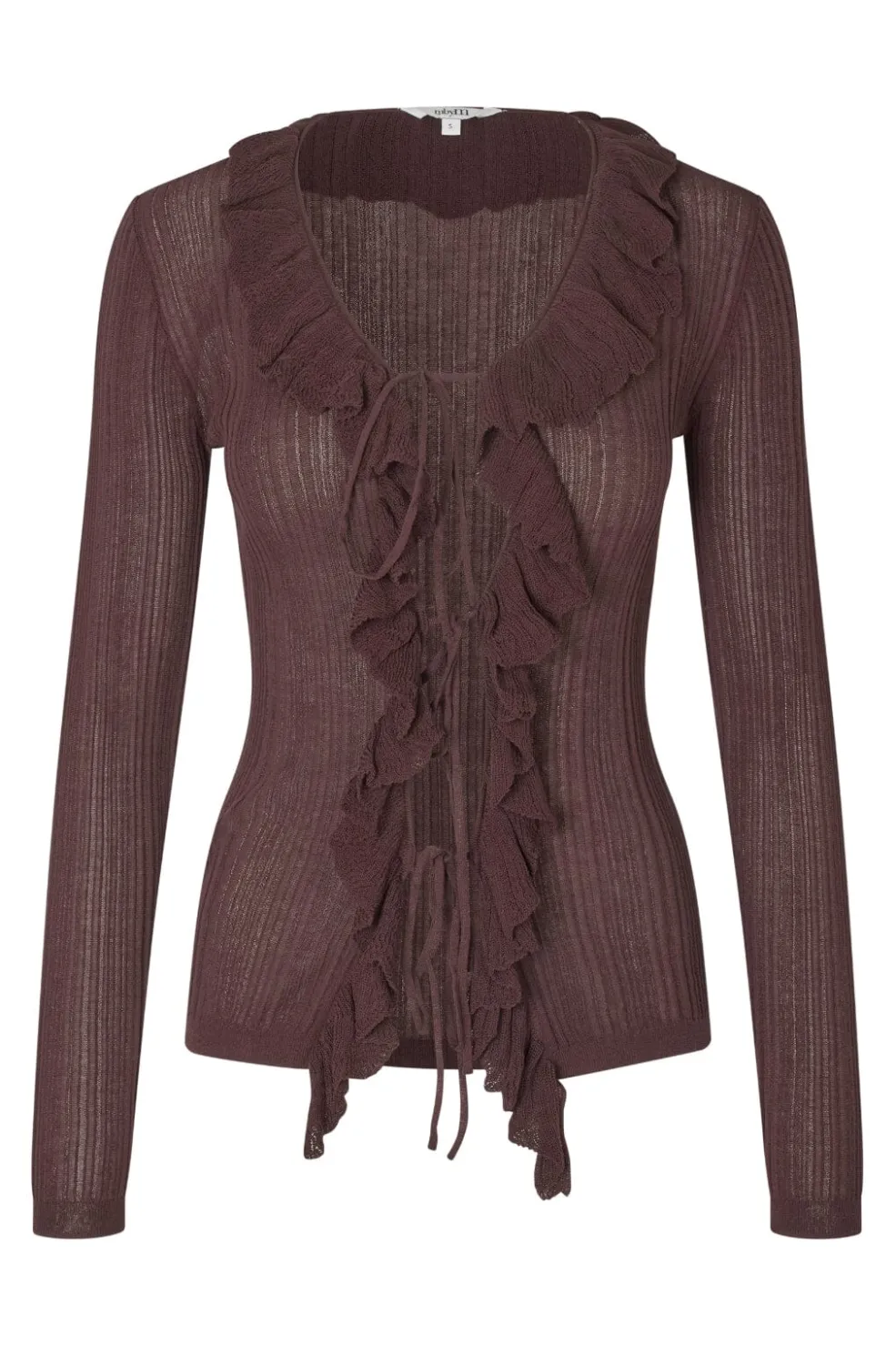 Brun striktrøje fra MbyM med flæser langs fronten og en ribbet struktur. Trøjen har lange ærmer, V-hals og snørelukning.