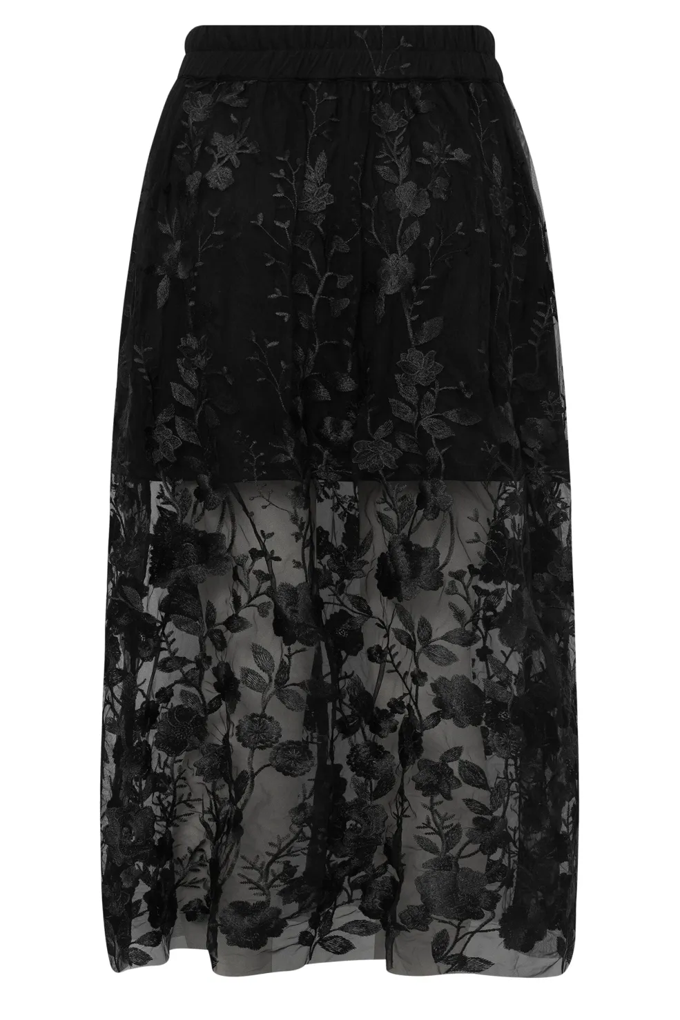 Lang sort nederdel fra A-View lavet af gennemsigtig mesh med broderet blomstermønster. Nederdelen har elastisk talje og kommer med en kortere undernederdel.