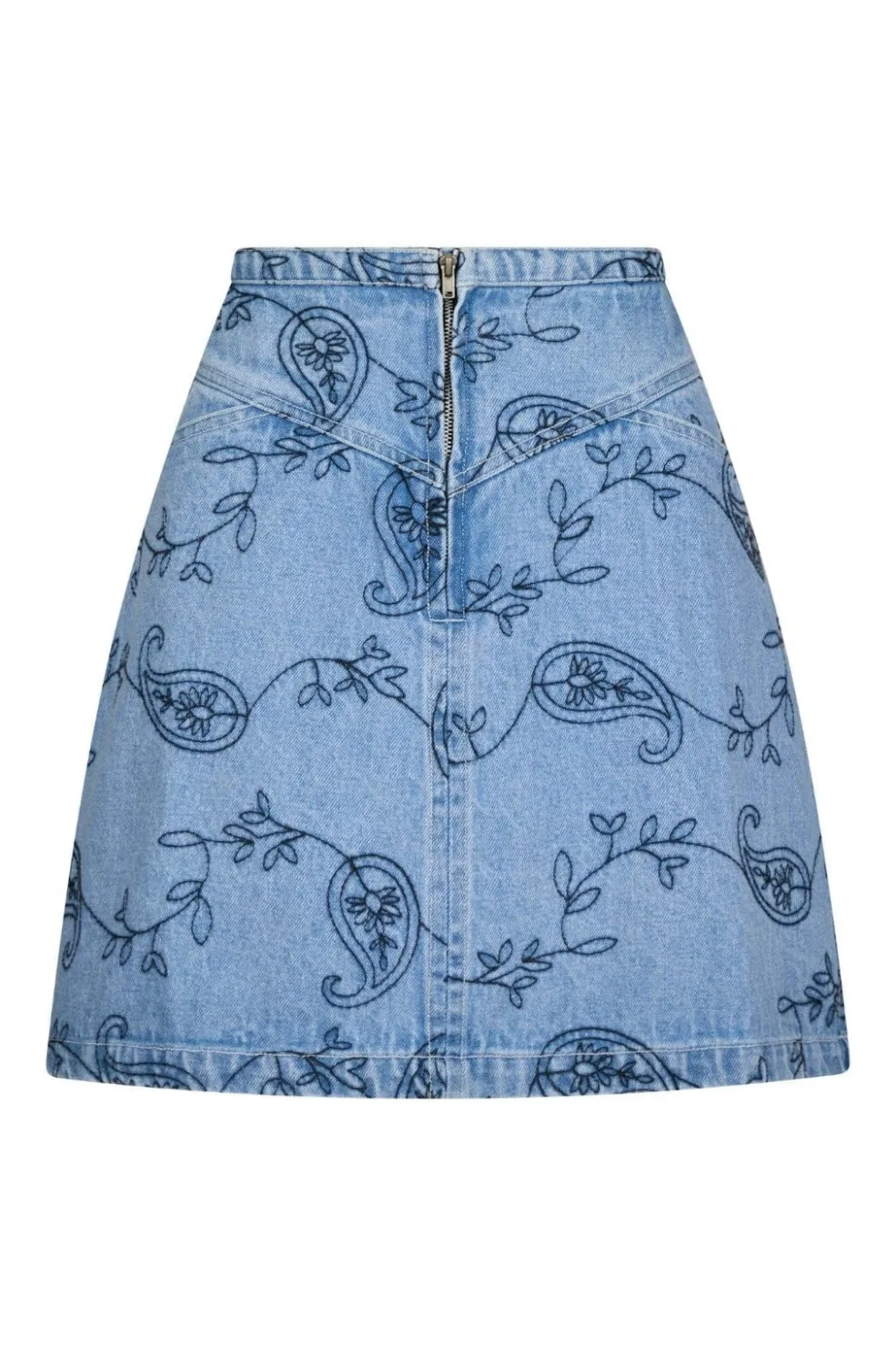 Denim nederdel fra Neo Noir i blå. Nederdelen har et karakteristisk paisley- og blomsterbroderi over hele stoffet samt stikningsdetaljer, der giver den et særegent udseende.