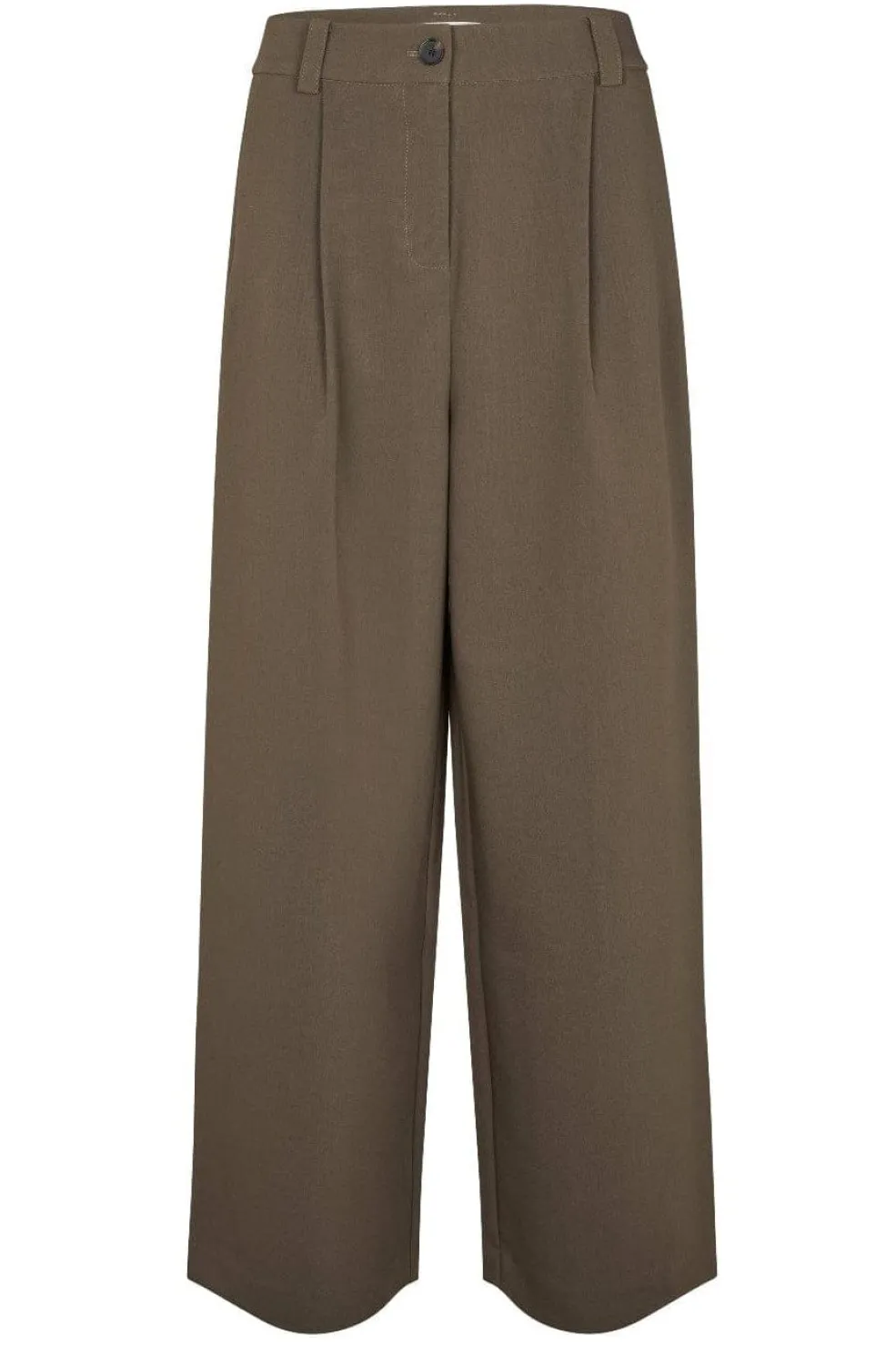 Brede bukser fra Modström i brun espresso-farve. Bukserne passer til både hverdagen og mere formelle lejligheder.