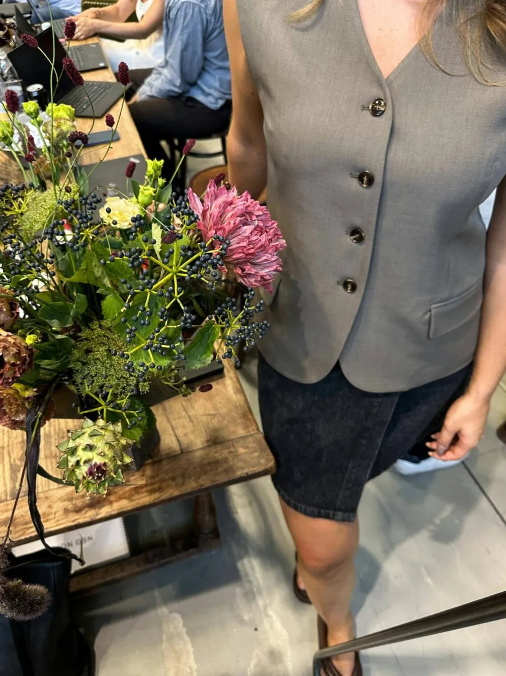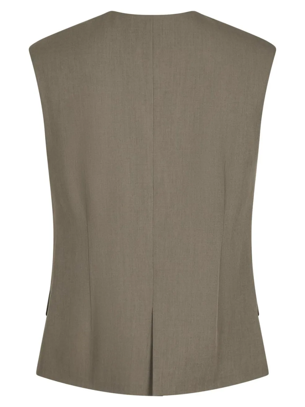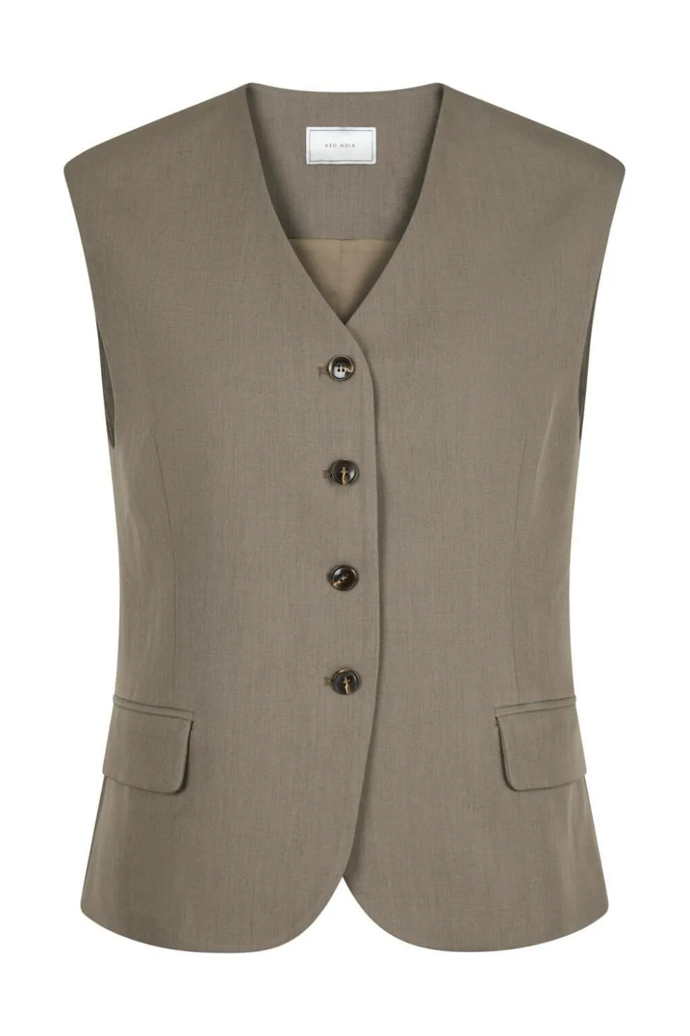 Khakifarvet vest med struktureret overflade fra Neo Noir. Vesten har V-halsudskæring, knaplukning foran og to praktiske lommer.