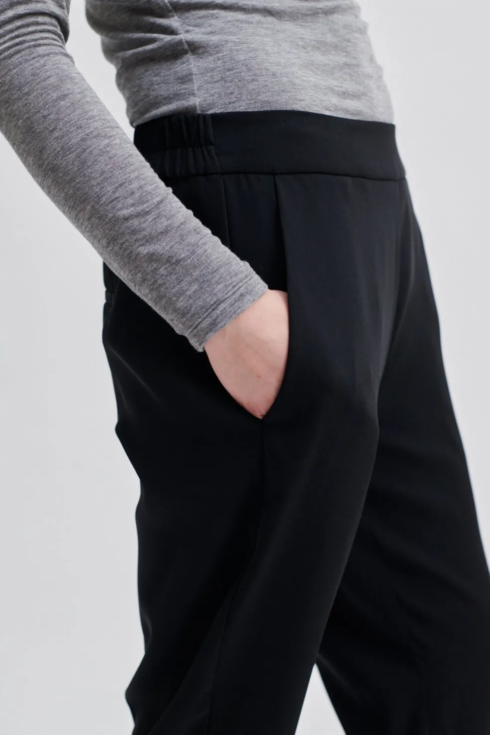 Sorte bukser fra Second Female i en halvblank polyesterkvalitet. Bukserne har lige ben med pressefolder og en bred linning med elastik bagpå.