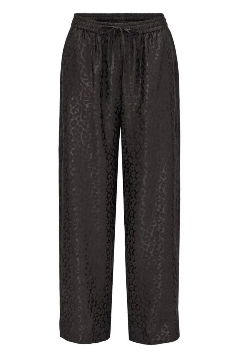 Sorte bukser fra Karmamia med diskret leopardmønster. Bukserne har en løs pasform og er lavet af en blanding af silke og viskose med et blødt fald.