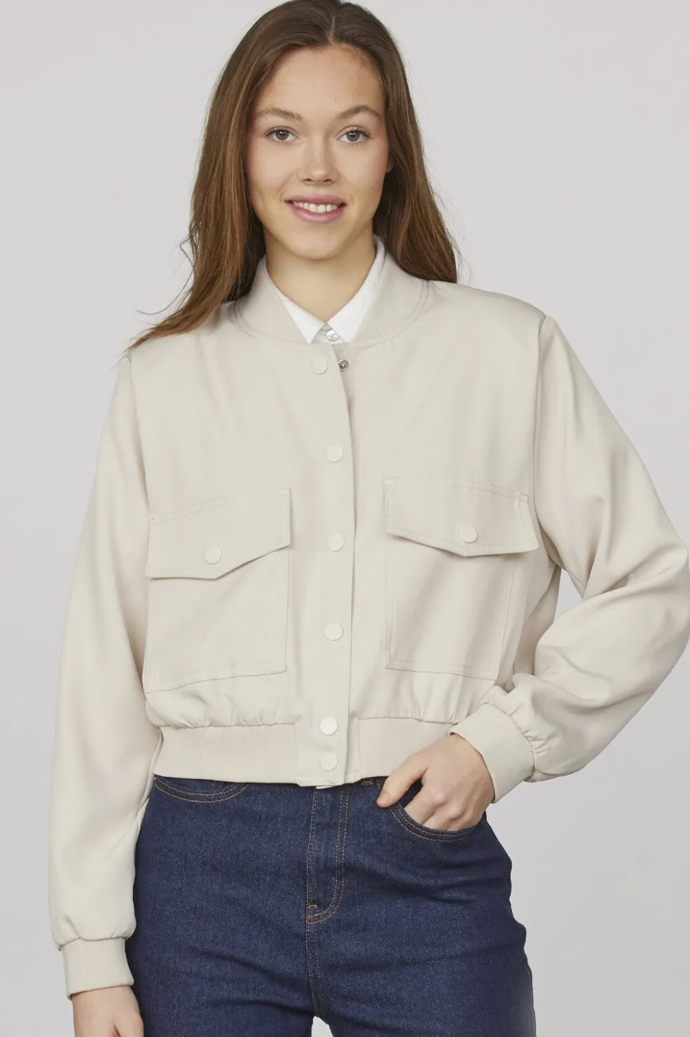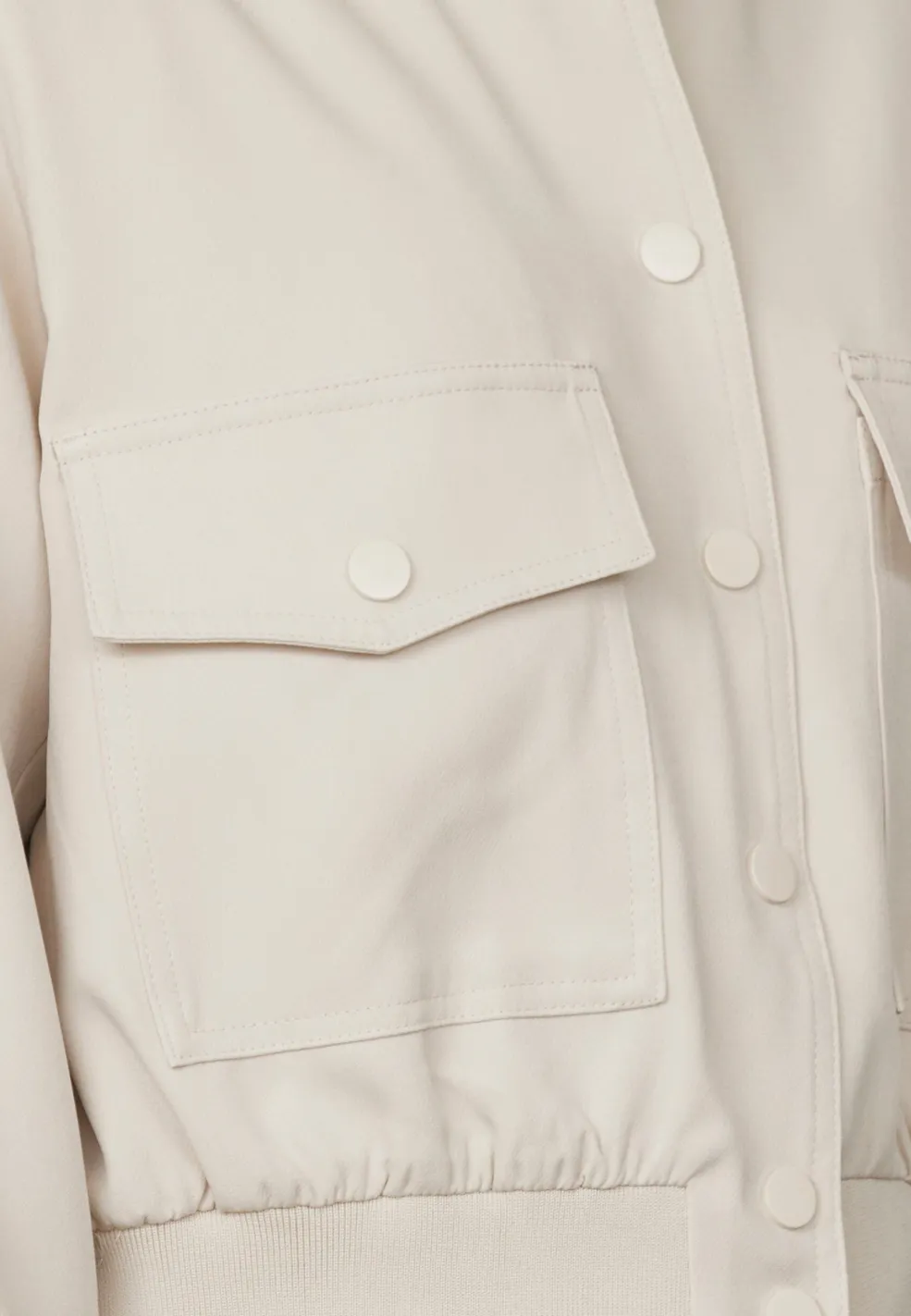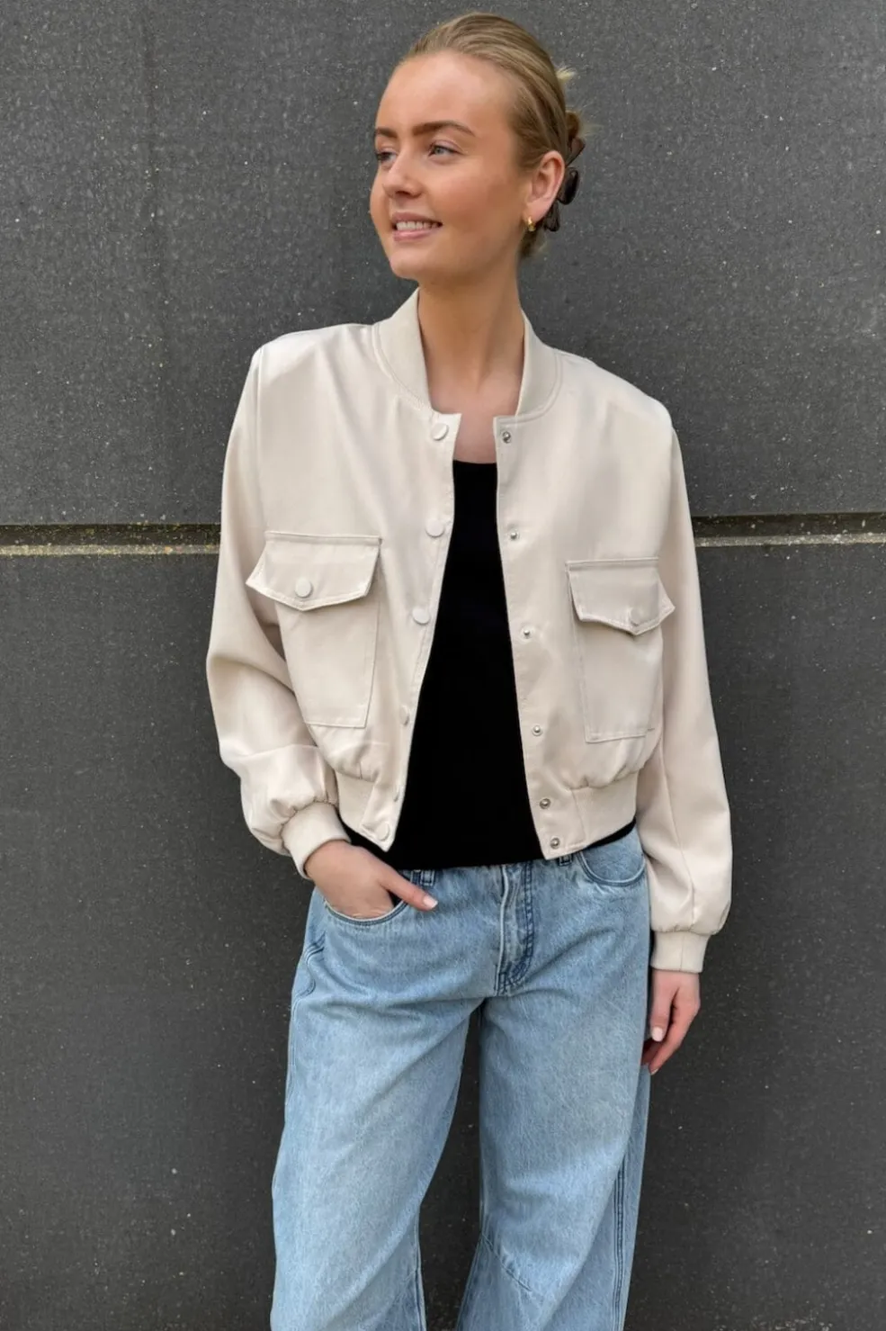 Beige bomberjakke med knaplukning foran. Jakken har en rund hals og brede ribkanter ved talje og nakke. De to forlommer og dekorative syninger giver jakken et sporty udtryk.