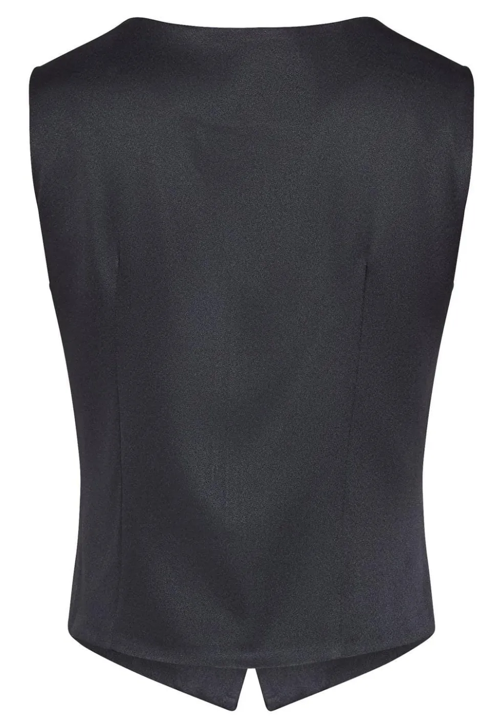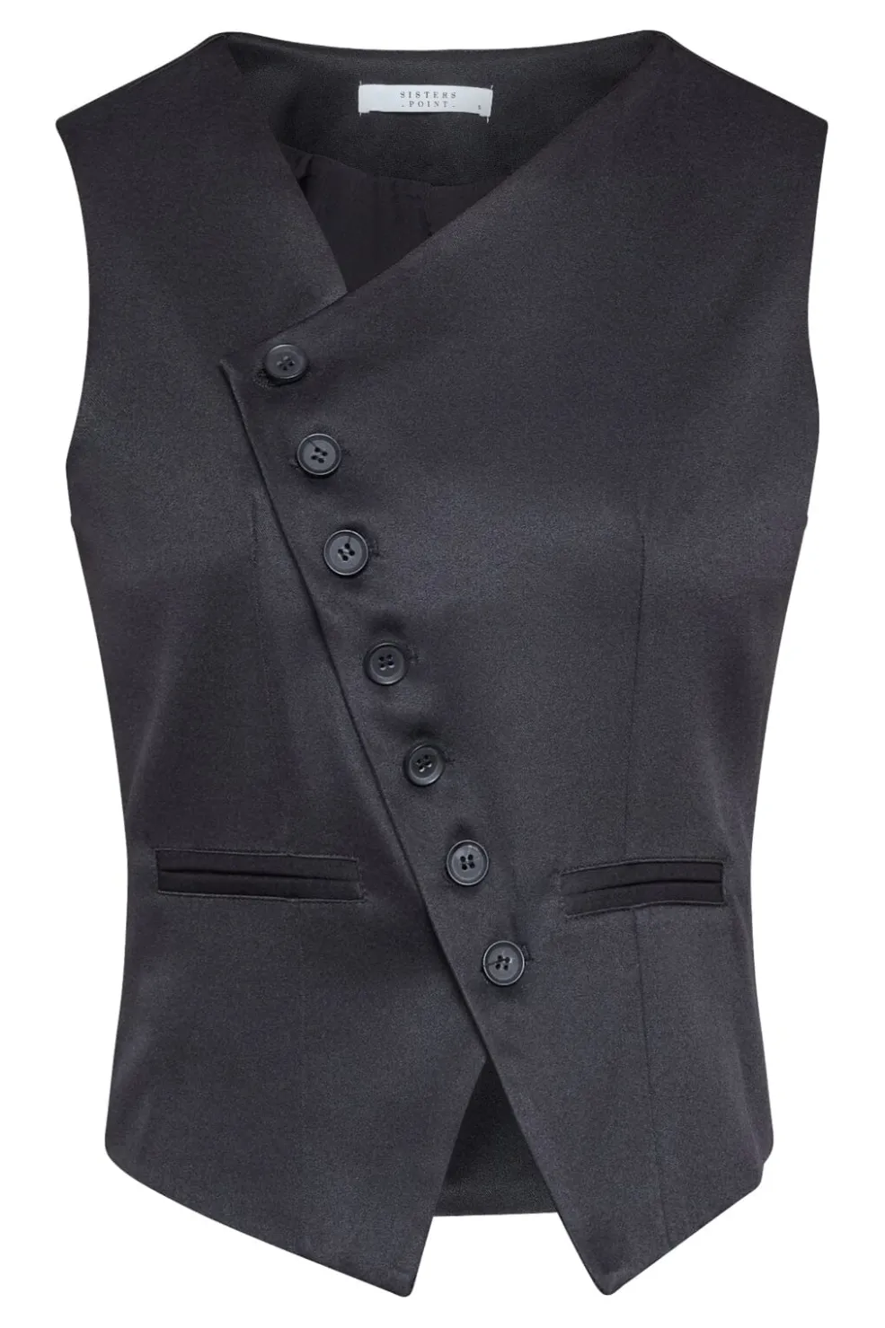 Sort vest fra Sisters Point med asymmetrisk knaplukning langs fronten. Vesten har en V-hals og et ærmeløst design med to dekorative lommer.