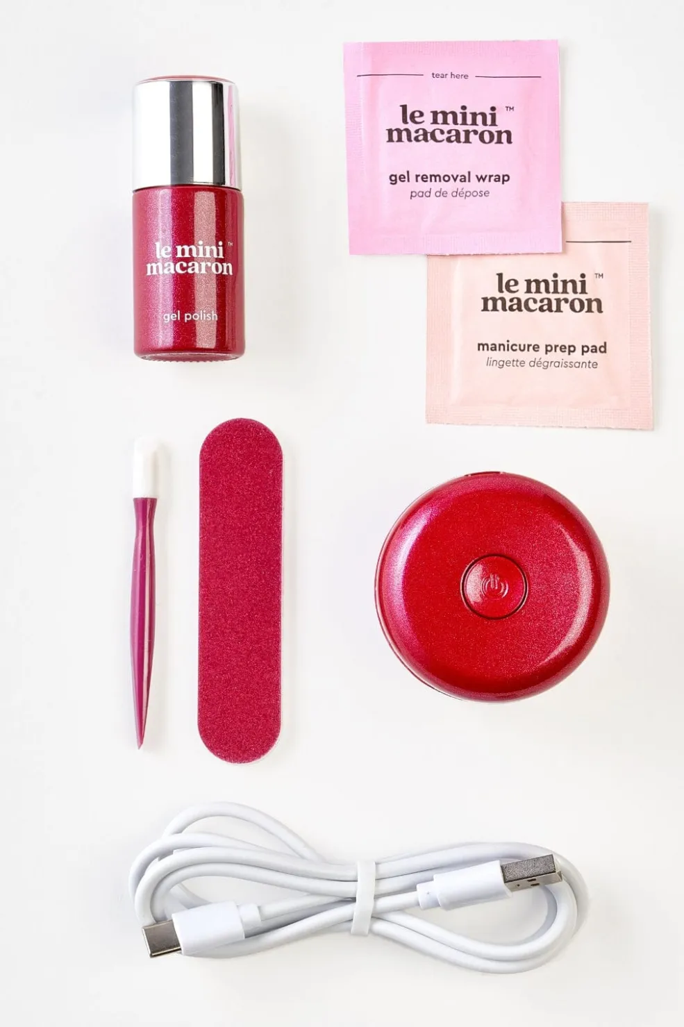 Gel manicure sæt med rød LED-lampe og rubinrød gel neglelak. Sættet indeholder alt det nødvendige til en holdbar gel manicure derhjemme.