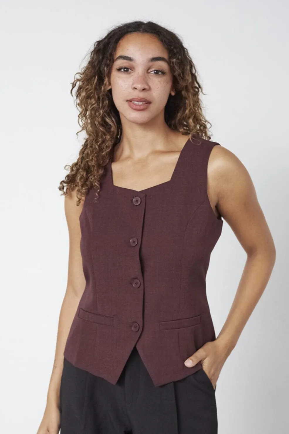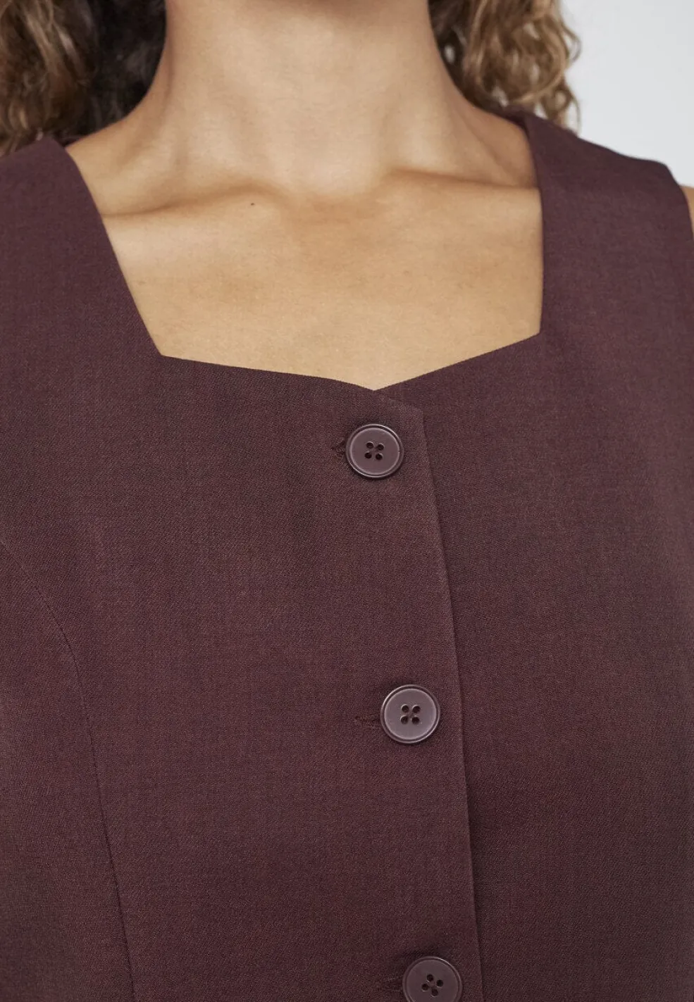 En ærmeløs vest fra Sisters Point i dyb bordeaux. Vesten har en slim fit-pasform og en firkantet halsudskæring med knaplukning foran.