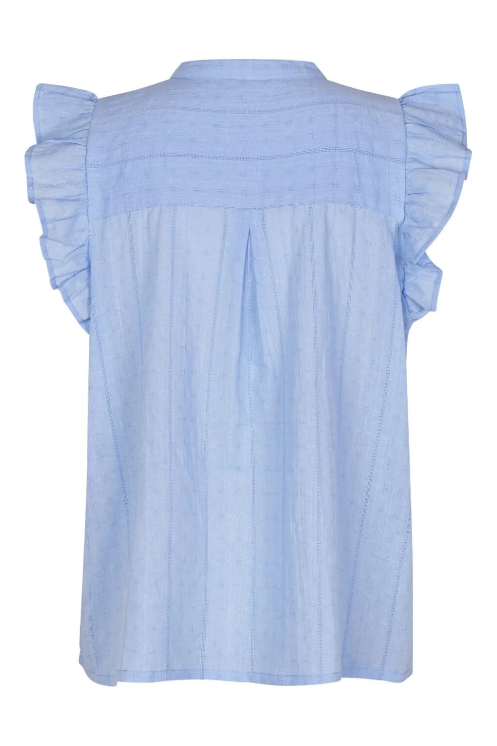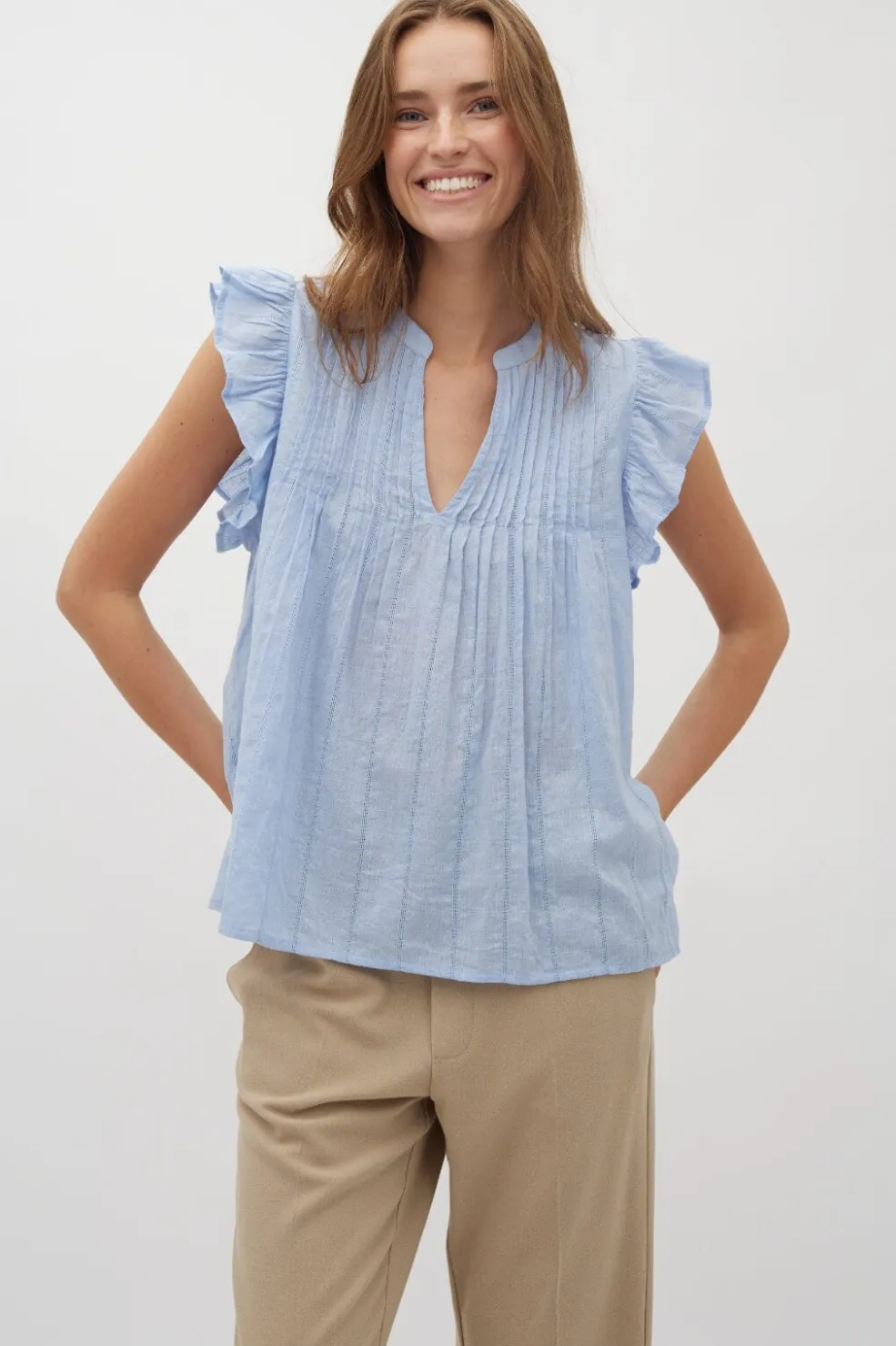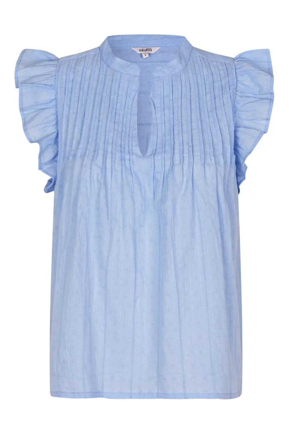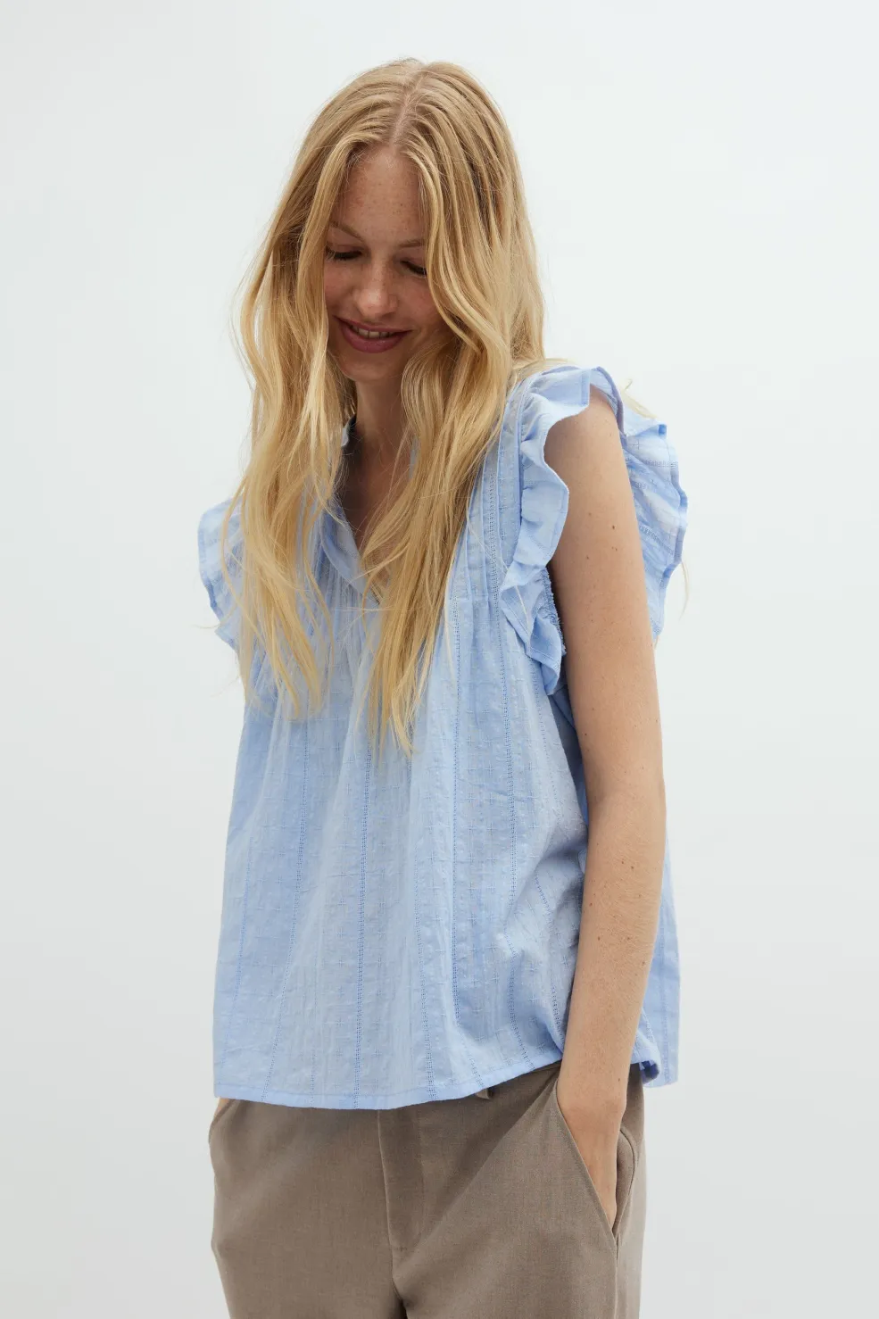 Lyseblå bluse fra MbyM med nålestriber og flæsedetaljer. Blusen har en plisseret front og dekorative syninger, der giver den karakter. V-halsudskæring og ærmeløst design.