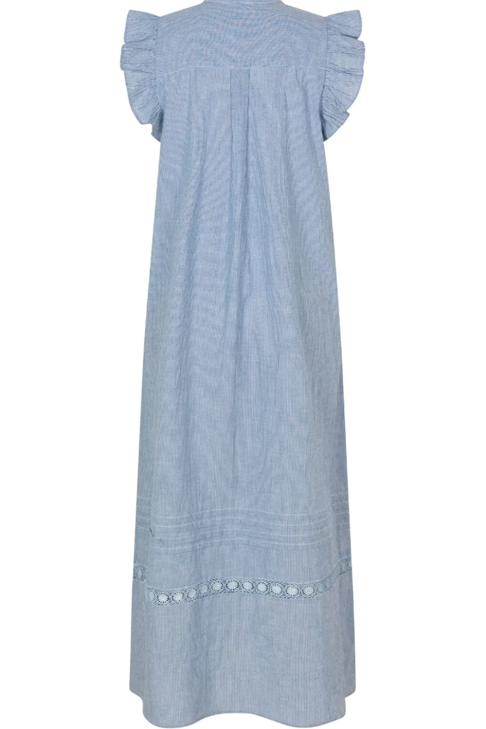 Lang kjole fra MbyM i blå og hvide striber. Kjolen har flæser ved ærmerne og blondedetaljer langs kanten. Den dekorative syning giver kjolen et håndlavet præg.