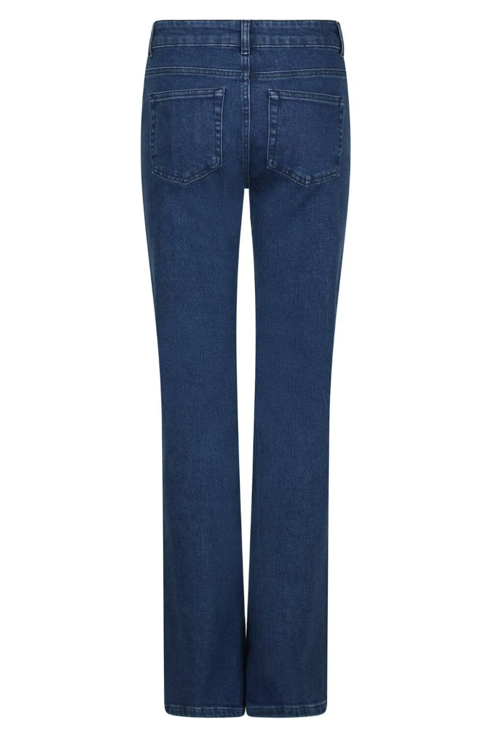 Denimbukser fra Neo Noir i mellemblå med slim fit og et flagrende design fra knæet. Den slanke pasform kombineres med flæsedetaljer, der giver bukserne et særpræg.