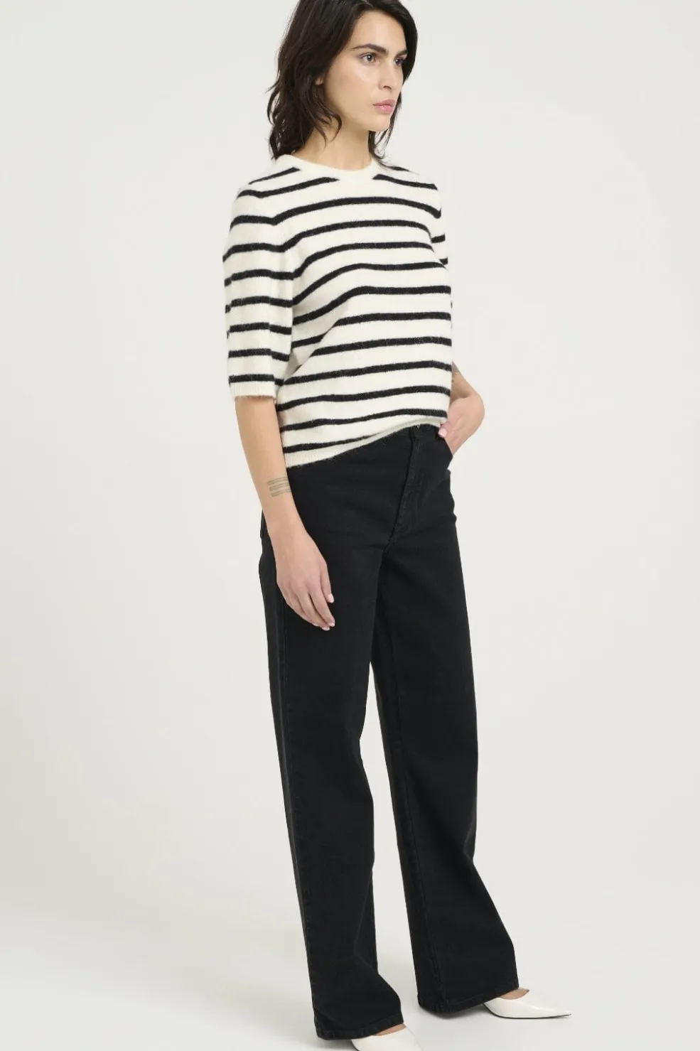 Stribet bluse fra Gestuz med sort-hvide striber. Blusen har 3/4-ærmer og rund hals. Den er lavet af en blanding af naturlige og strækbare materialer.
