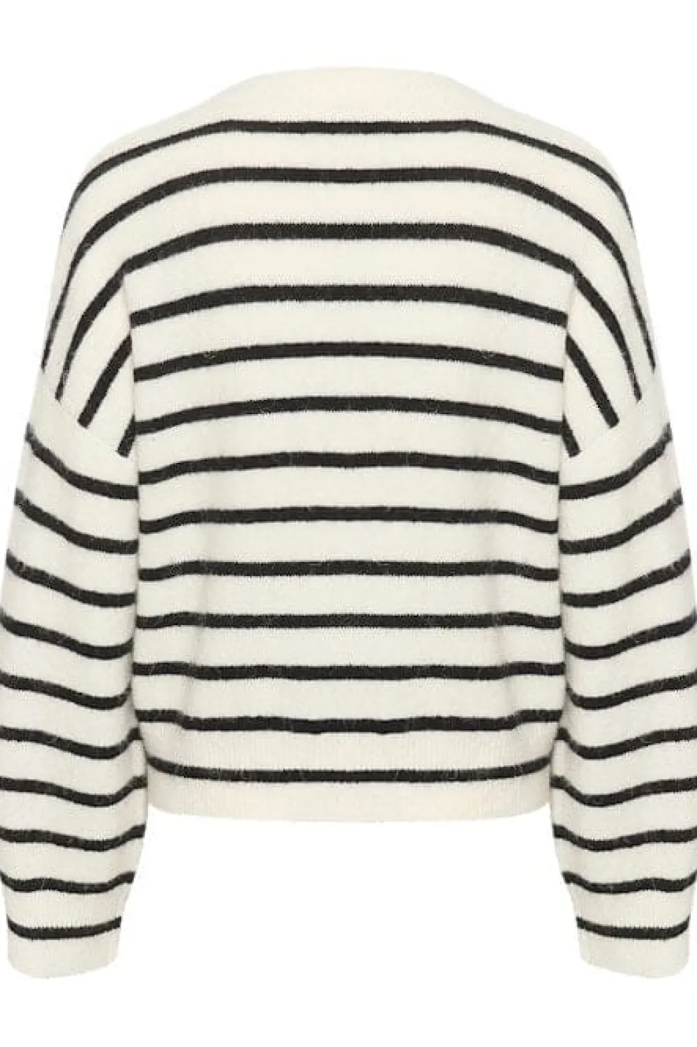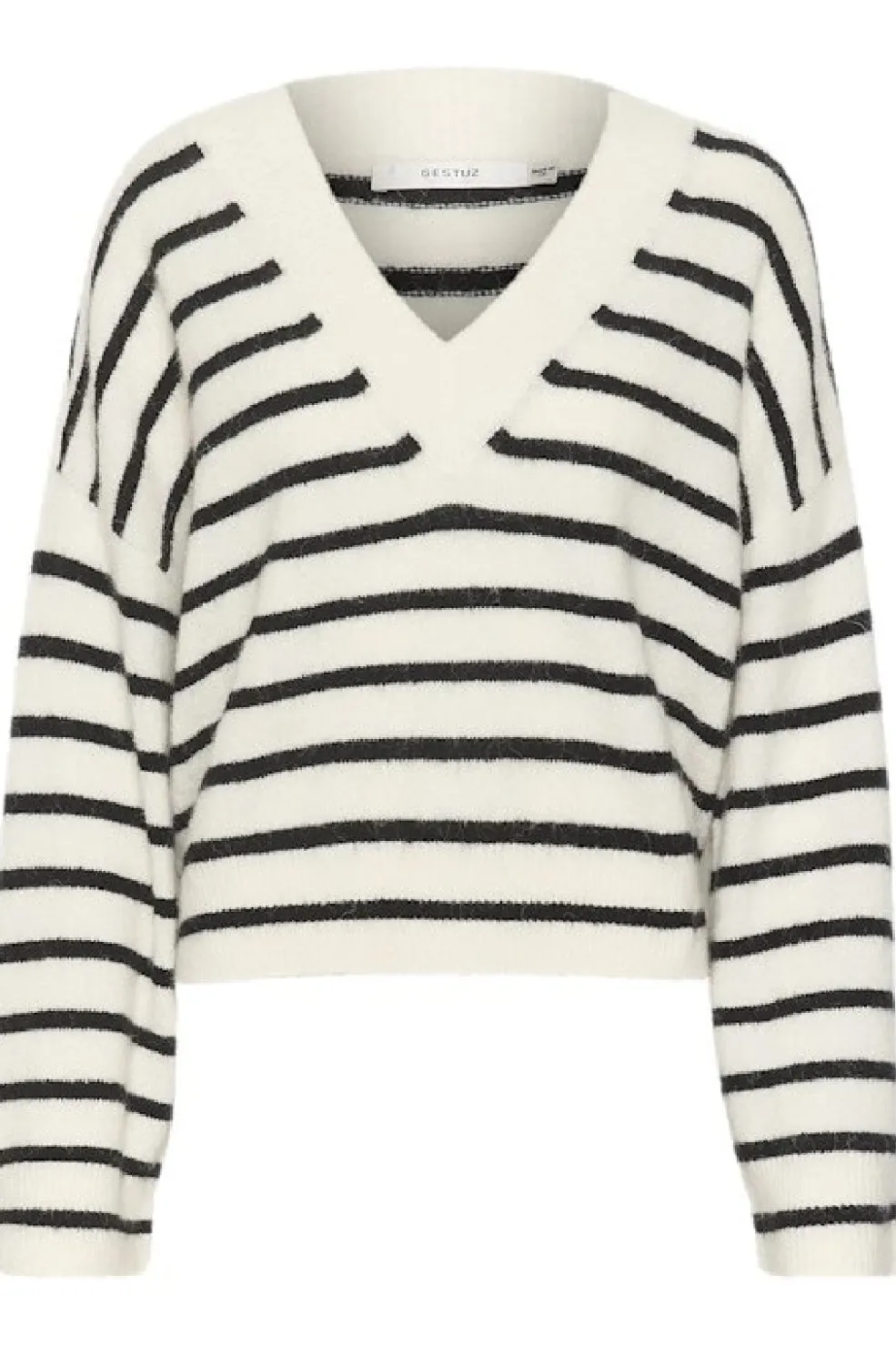Stribet sweater fra Gestuz med V-hals og lange ærmer. Den hvide sweater har sorte vandrette striber og en regular fit.
