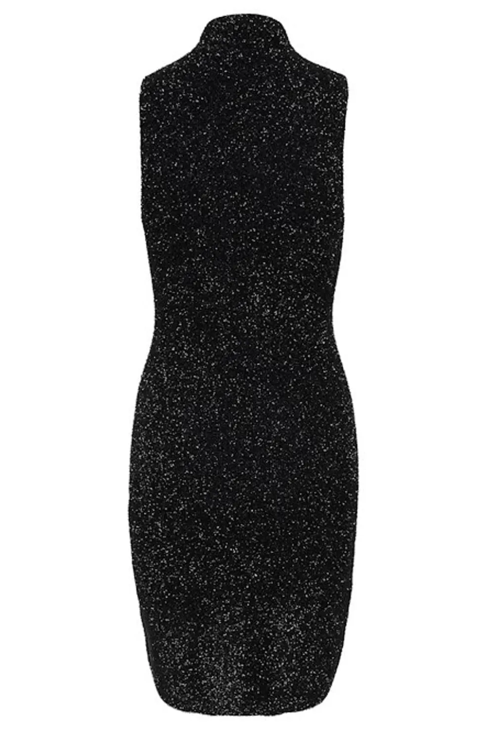 Sort kort kjole fra Gestuz med høj hals og skinnende overflade. Kjolen har perledetaljer og pailletter, der skaber et festligt udtryk.