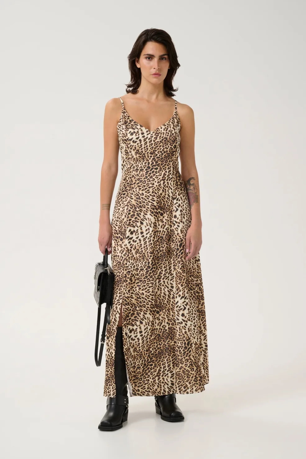 Ankellang kjole fra Gestuz med et lyst leopardprint. Kjolen har en V-udskæring, justerbare spaghetti-stropper og en sideslids, der giver god bevægelighed.