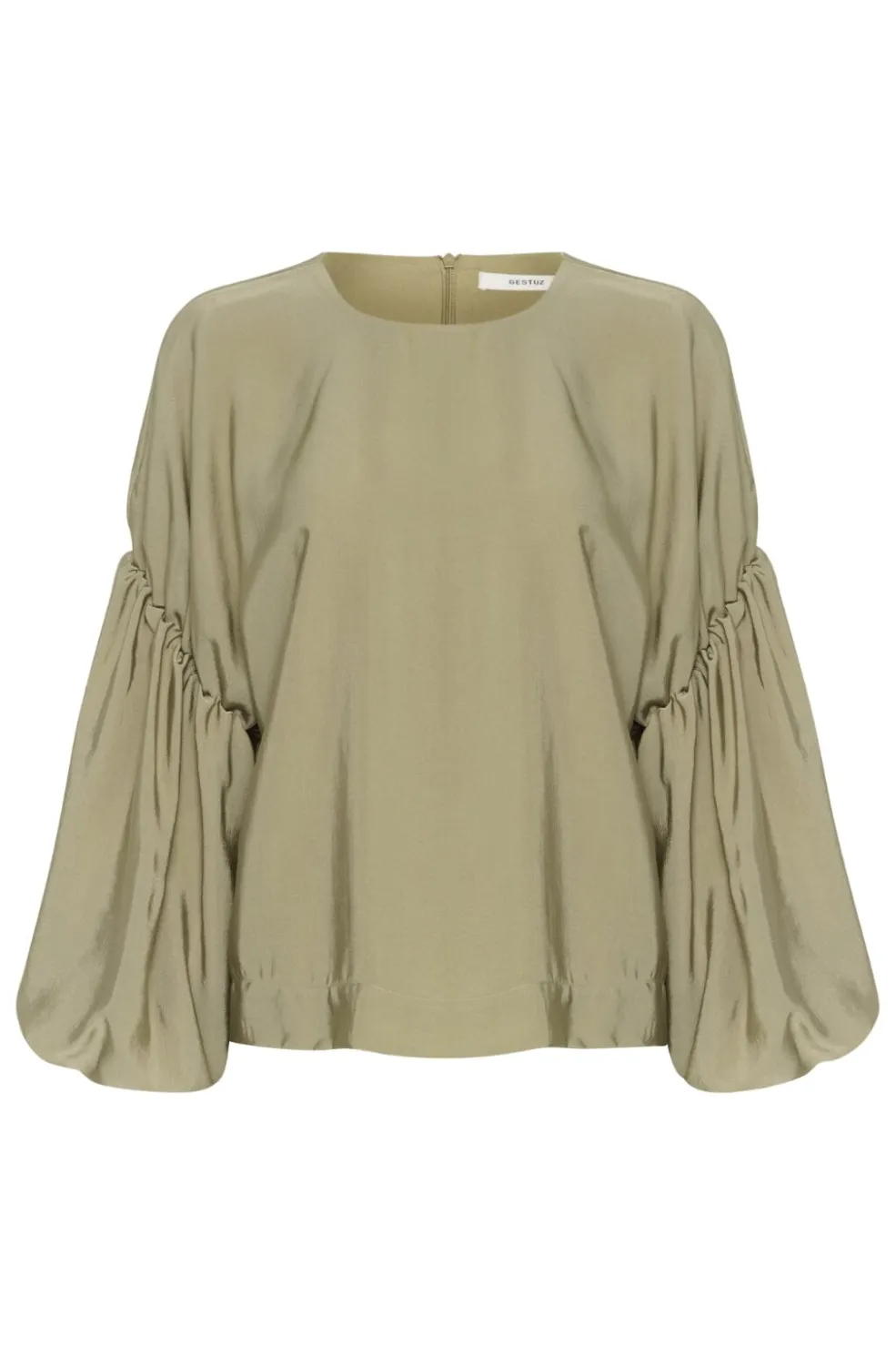 Bluse fra Gestuz i en dæmpet salviegrøn farve. Den løse silhuet med ballonærmer skaber en behagelig pasform, der giver god bevægelsesfrihed.