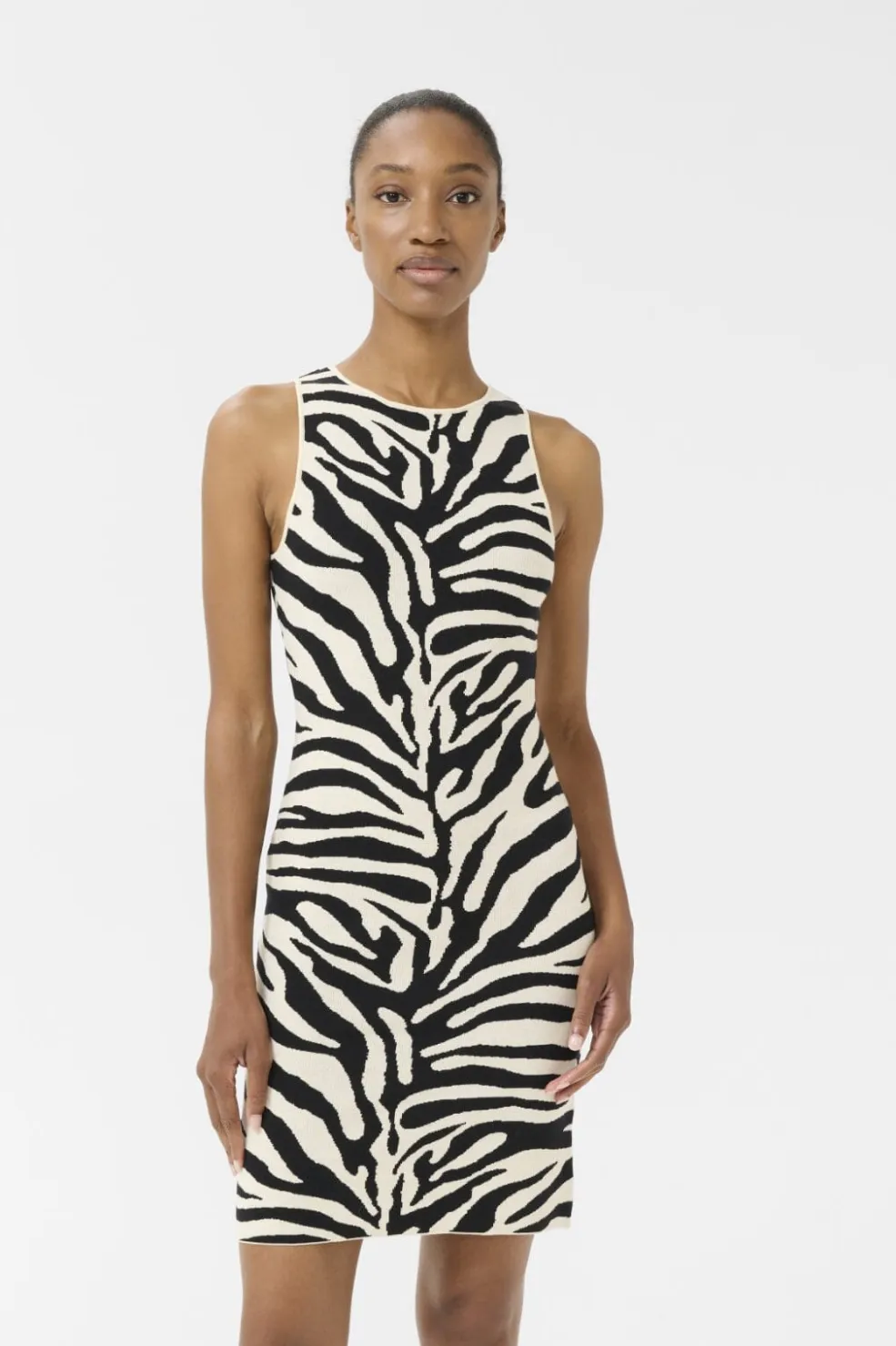 Ærmeløs kjole fra Gestuz med zebraprint i sort og birch. Den har en rund halsudskæring og en lige silhuet, der går til midt på låret.