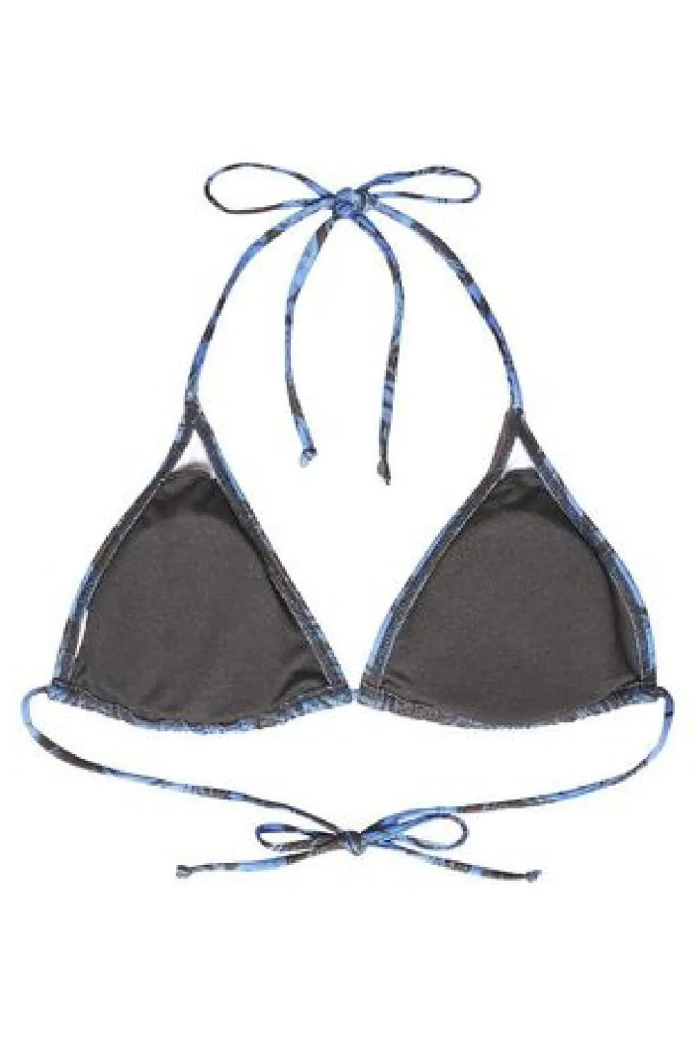 Bikinioverdel fra Gestuz i blå og sort mønster. Den trekantede top har bindebånd i nakken og om ryggen samt sløjfedetaljer, der giver mulighed for tilpasning.
