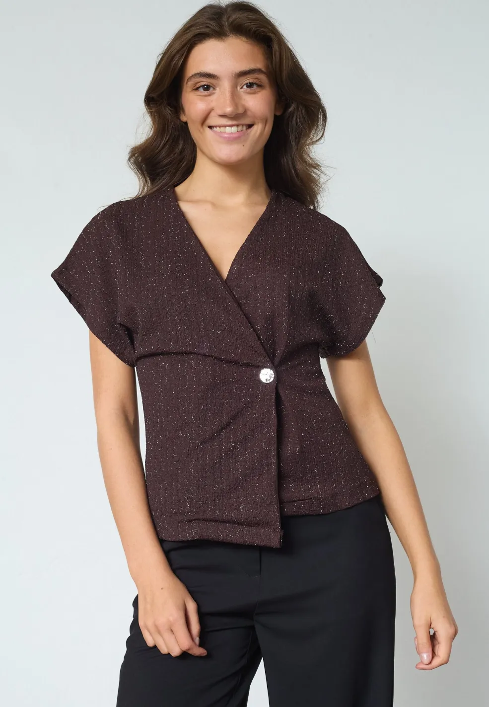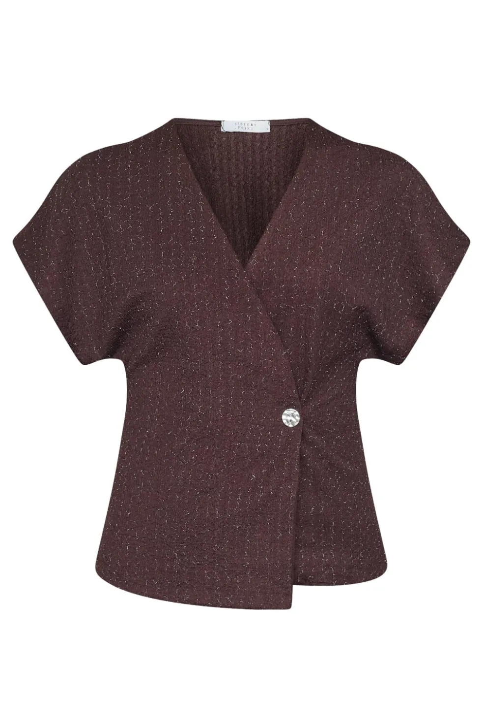er en elegant vest med et asymmetrisk snit og en v-udskæring. Den har en struktureret overflade. Vesten har brede skuldre og en enkelt knaplukning, der skaber en moderne og unik stil. Modellen har en str. S på.