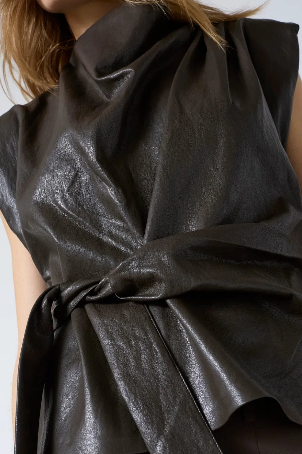 Ærmeløs top fra Co’Couture i mørkebrun. Toppen har en høj halsudskæring og bindebåndsdetaljer i taljen med et draperet design.
