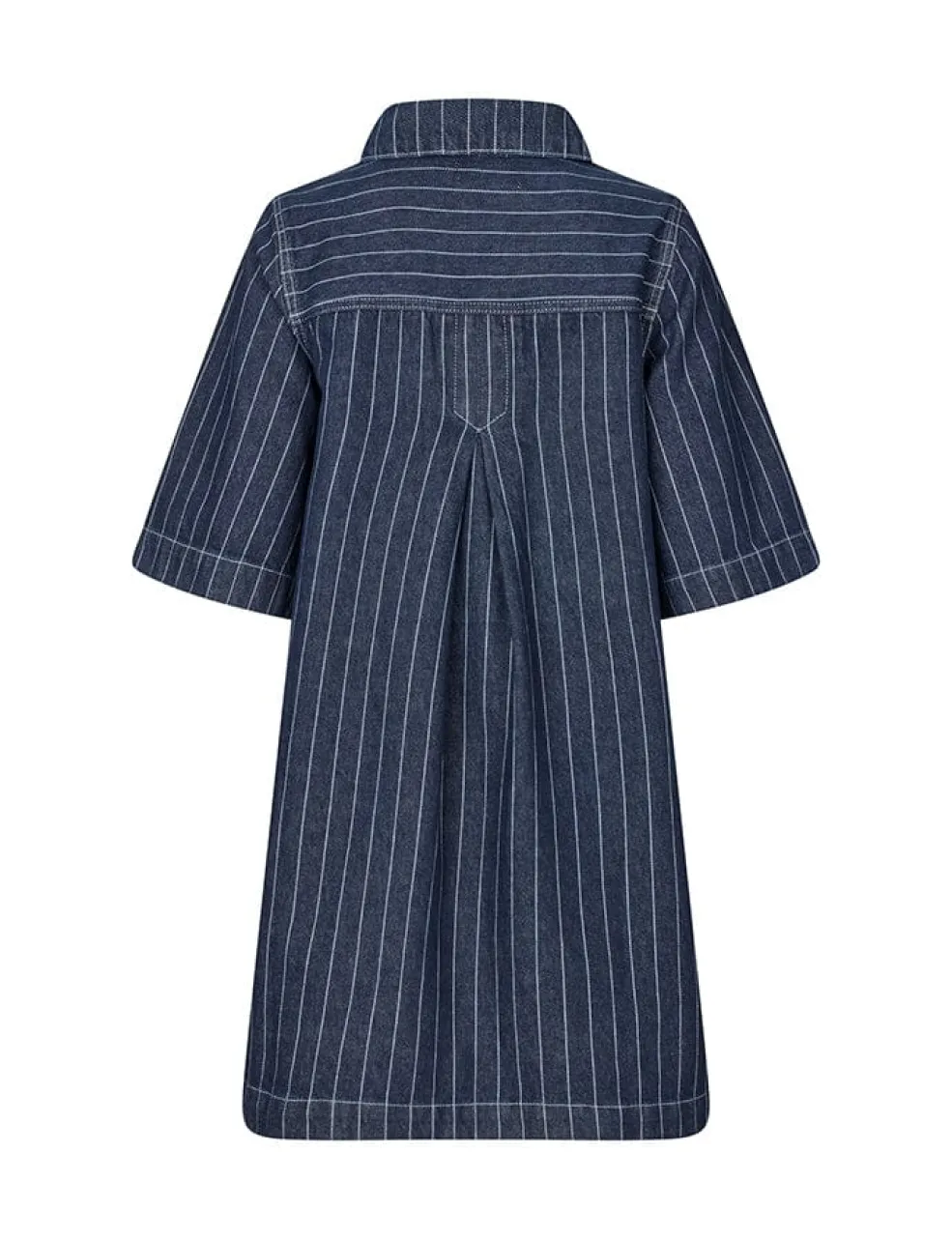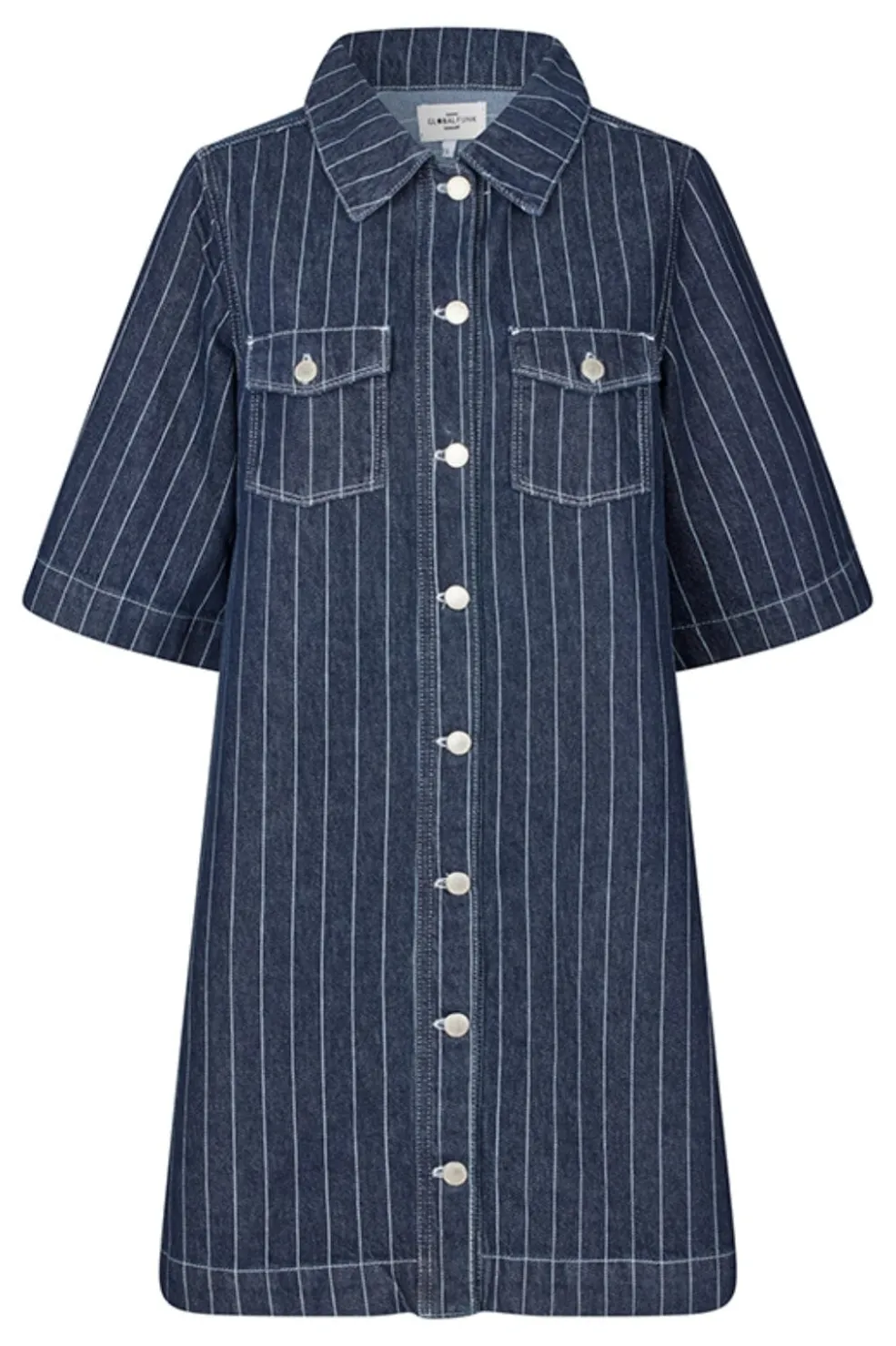 Denimkjole fra Global Funk i mørkeblå med pinstriber. Kjolen har skjortekrave, knaplukning og to brystlommer på forsiden. Den knælange model er lavet af bomuld.