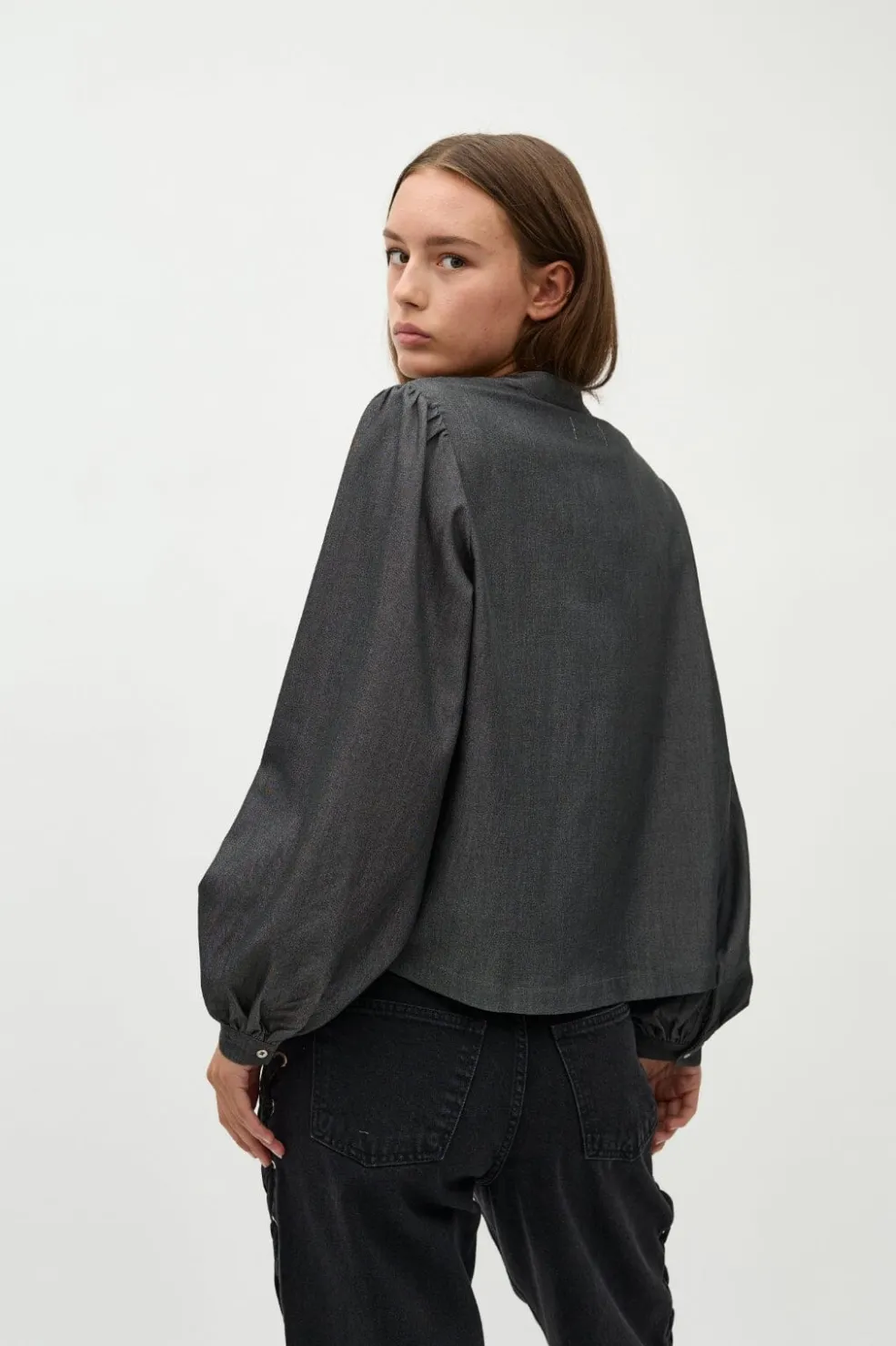 Sort bluse fra Global Funk med v-halsudskæring og lodrette plisseringer. Blusen har lange pufærmer og dekorative syninger, der giver den et gennemført design.