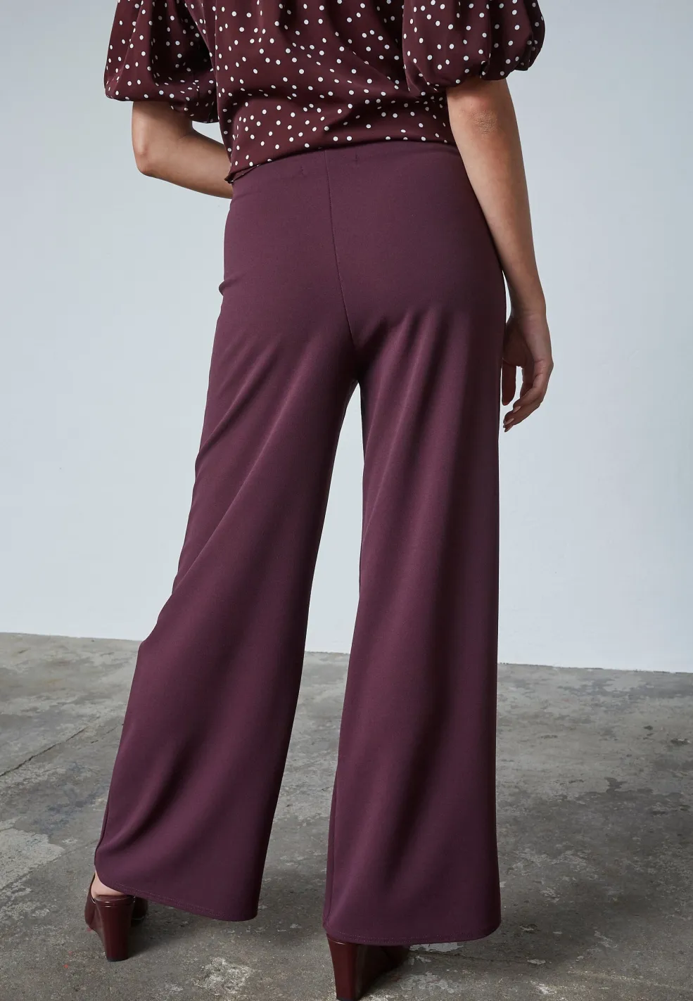 Bukser fra Sisters Point i dyb bordeaux. Bukserne har brede ben, høj talje og en løs pasform med elastik i taljen.