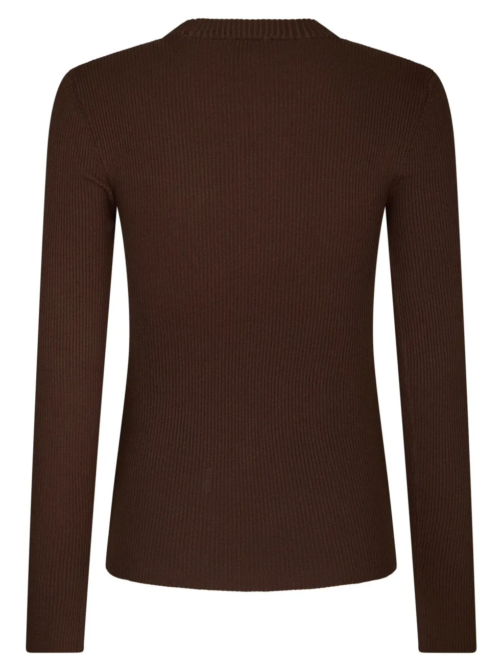 Mørkebrun strikbluse fra Valentin Studio med tyndstrikket tekstur. Blusen har en tætsiddende pasform og dekorative guldknapper på skuldrene, som giver et fint pift.