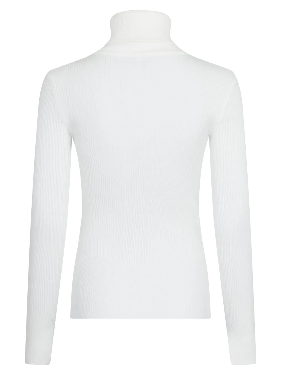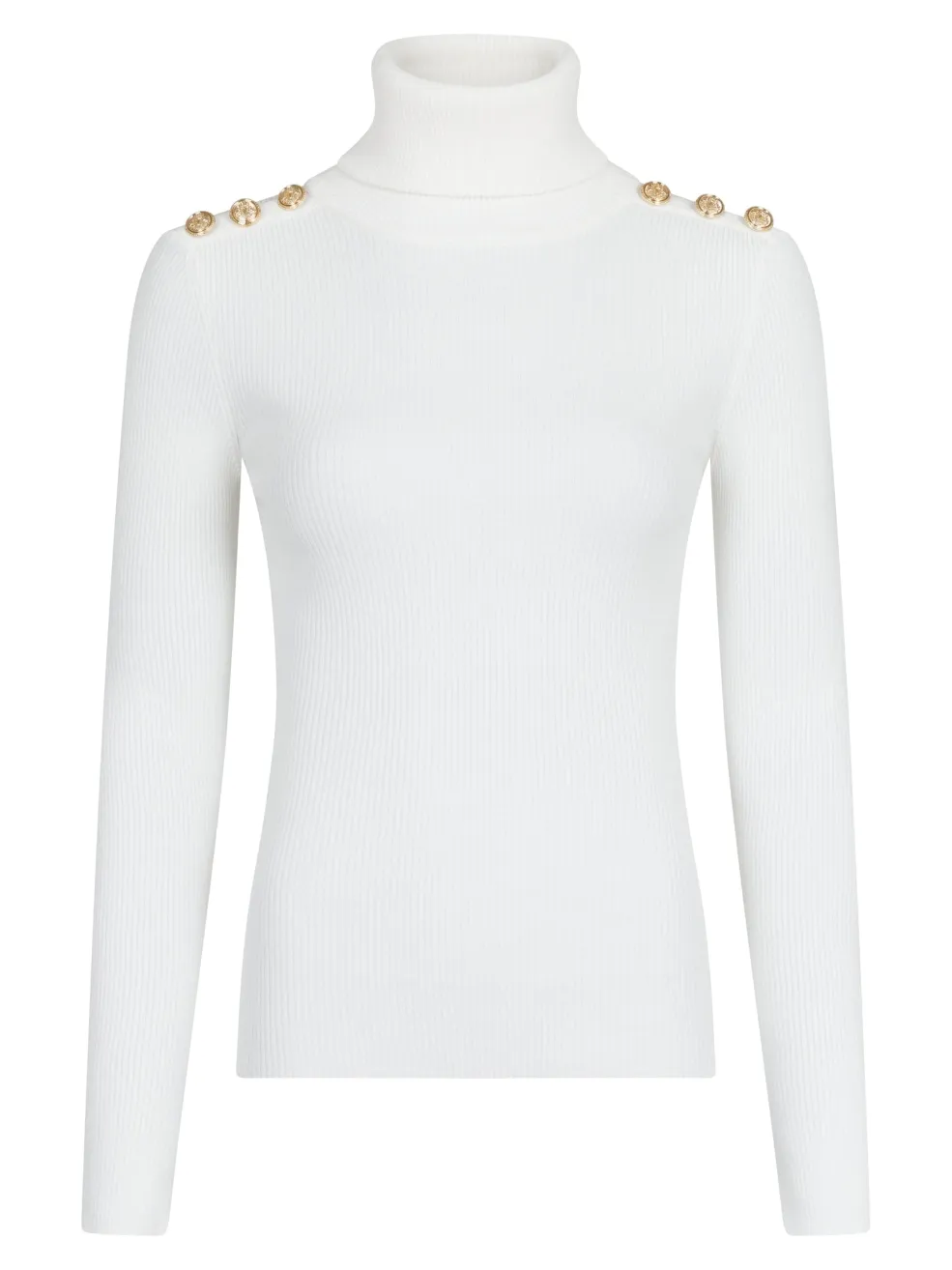 Strikket rullekravebluse fra Valentin Studio i off-white. Blusen har en ribbet tekstur og dekorative guldknapper på skuldrene. Den er strikket i en blød kvalitet med lange ærmer.
