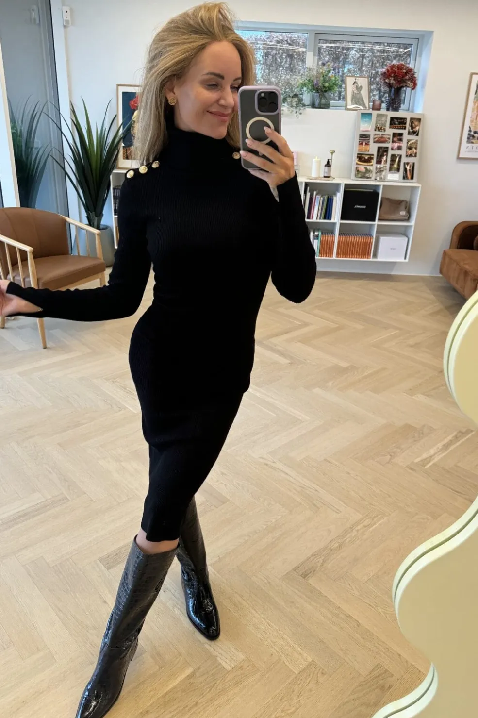 Sort strikkjole med ribstrikket design og guldknapper på skuldrene. Kjolen har en høj rullekrave og lange ærmer. Strikken former sig efter kroppen med et tætsiddende snit ned til læggene.