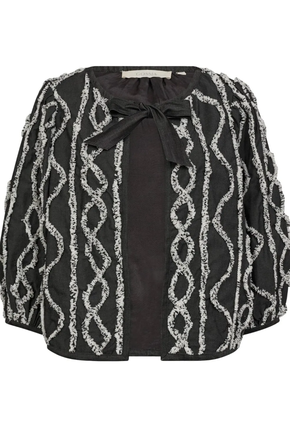 Grå jakke fra Gossia med et slangemønster i lys farve. Jakken har pufærmer og et knyttebånd ved halsen, der giver den et særegent udseende.