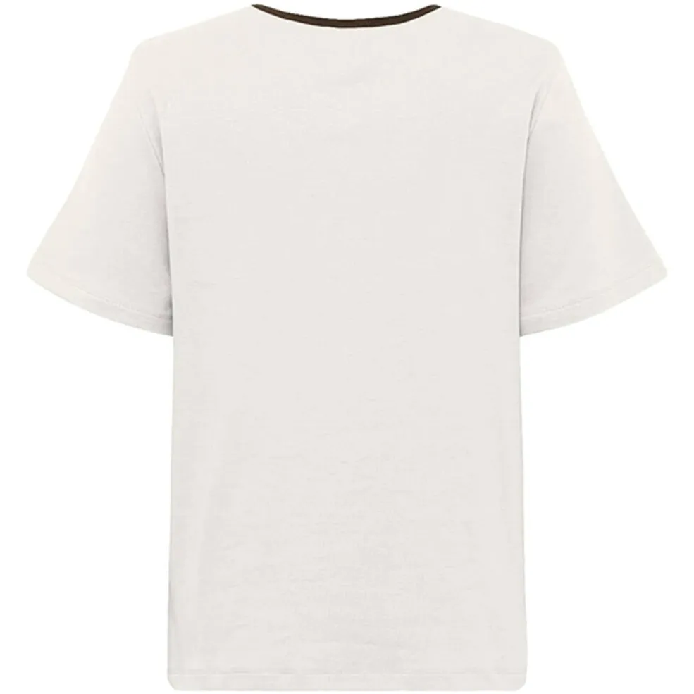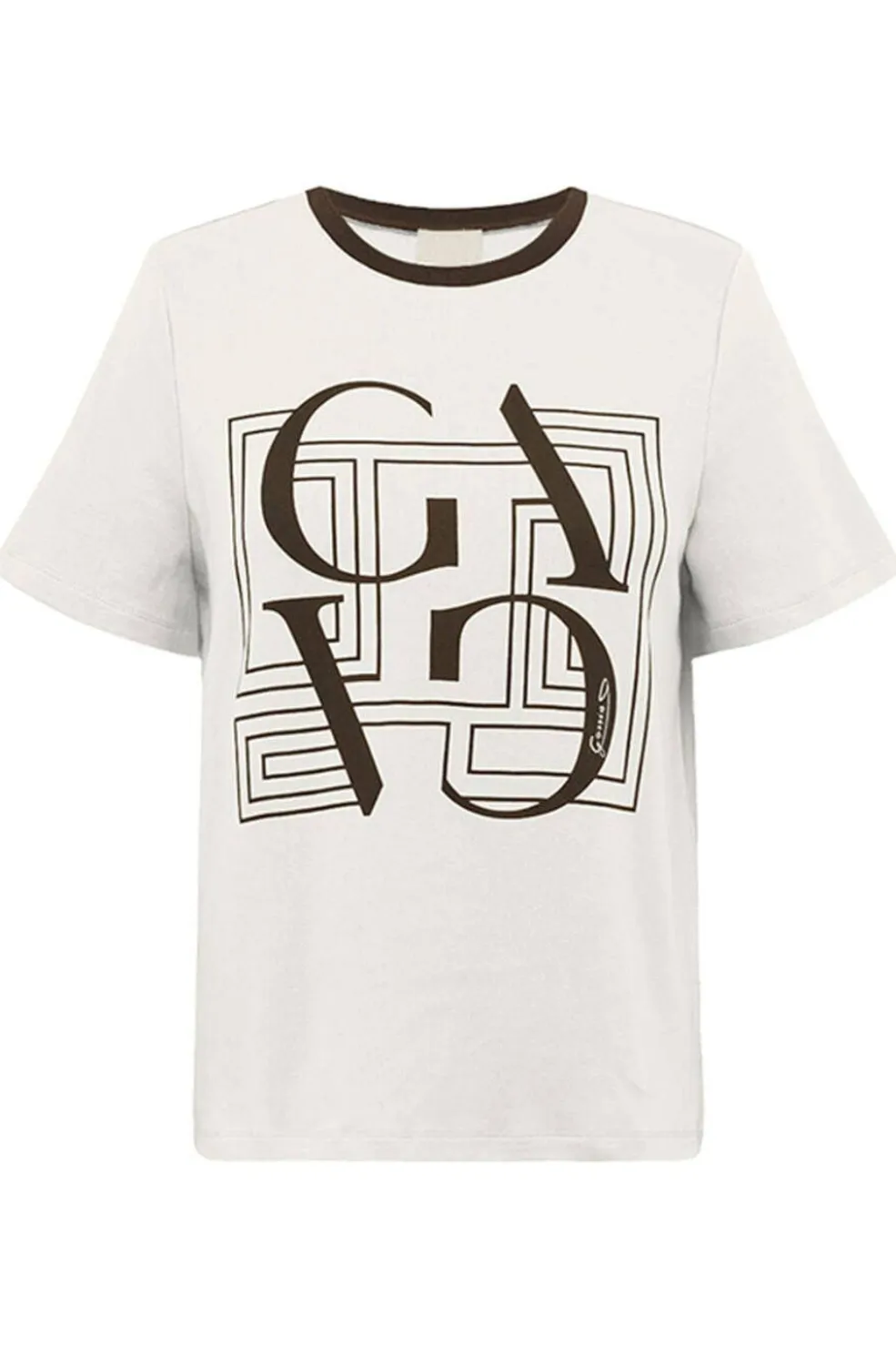 Cremefarvet t-shirt fra Gossia med stort grafisk frontprint og mørk halsrib. T-shirten har korte ærmer og er lavet i en blød bomuldsblanding, der gør den behagelig at have på.