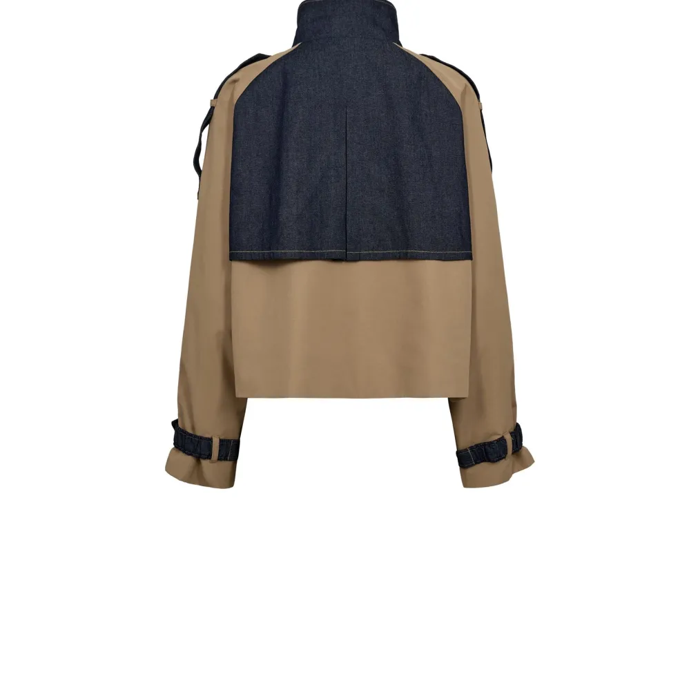 En jakke fra Gossia i blød camel-farve kombineret med mørkt denimlignende stof. Jakken har dobbeltknaplukning og en høj krave.