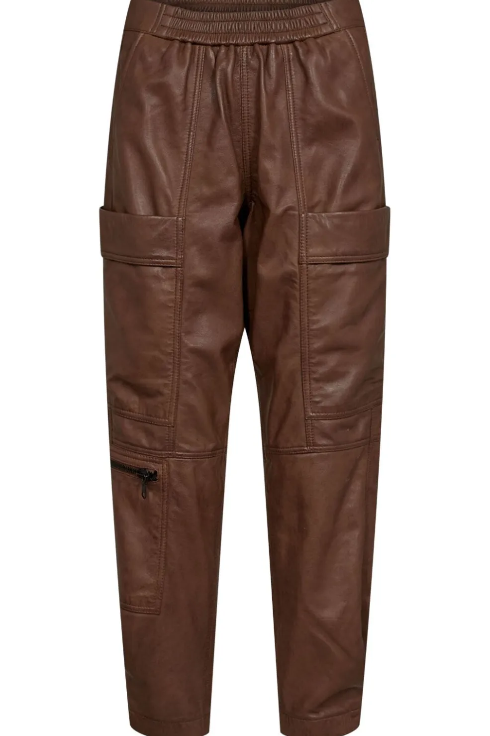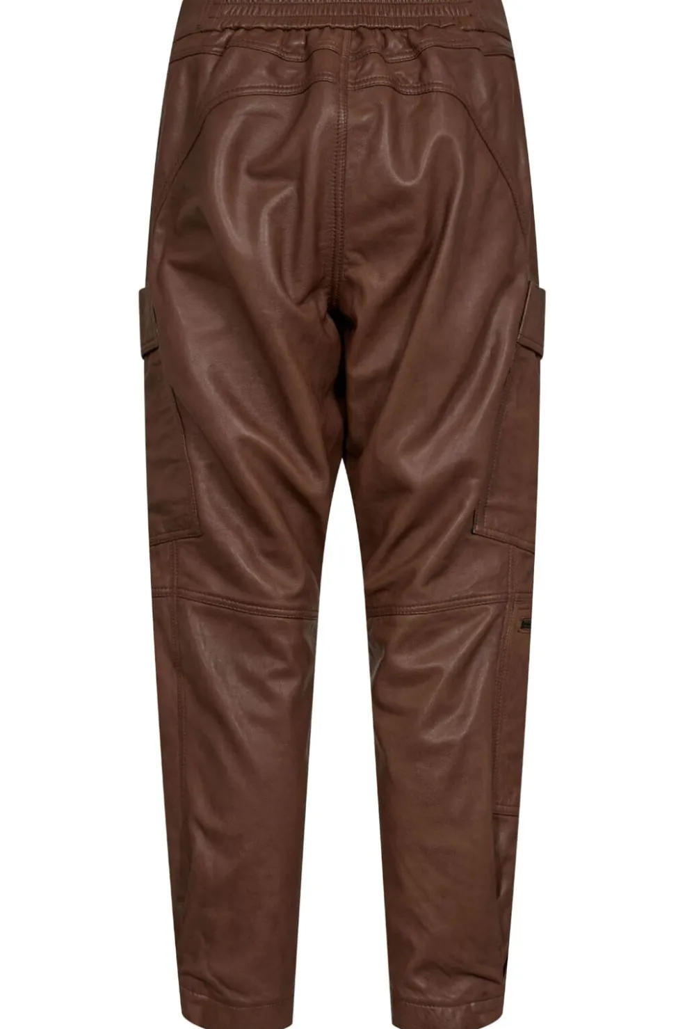 Brune læderbukser fra Gossia i lammeskind med løs pasform. Bukserne har lårlommer og en lynlåslomme nederst på benet samt elastik i taljen.