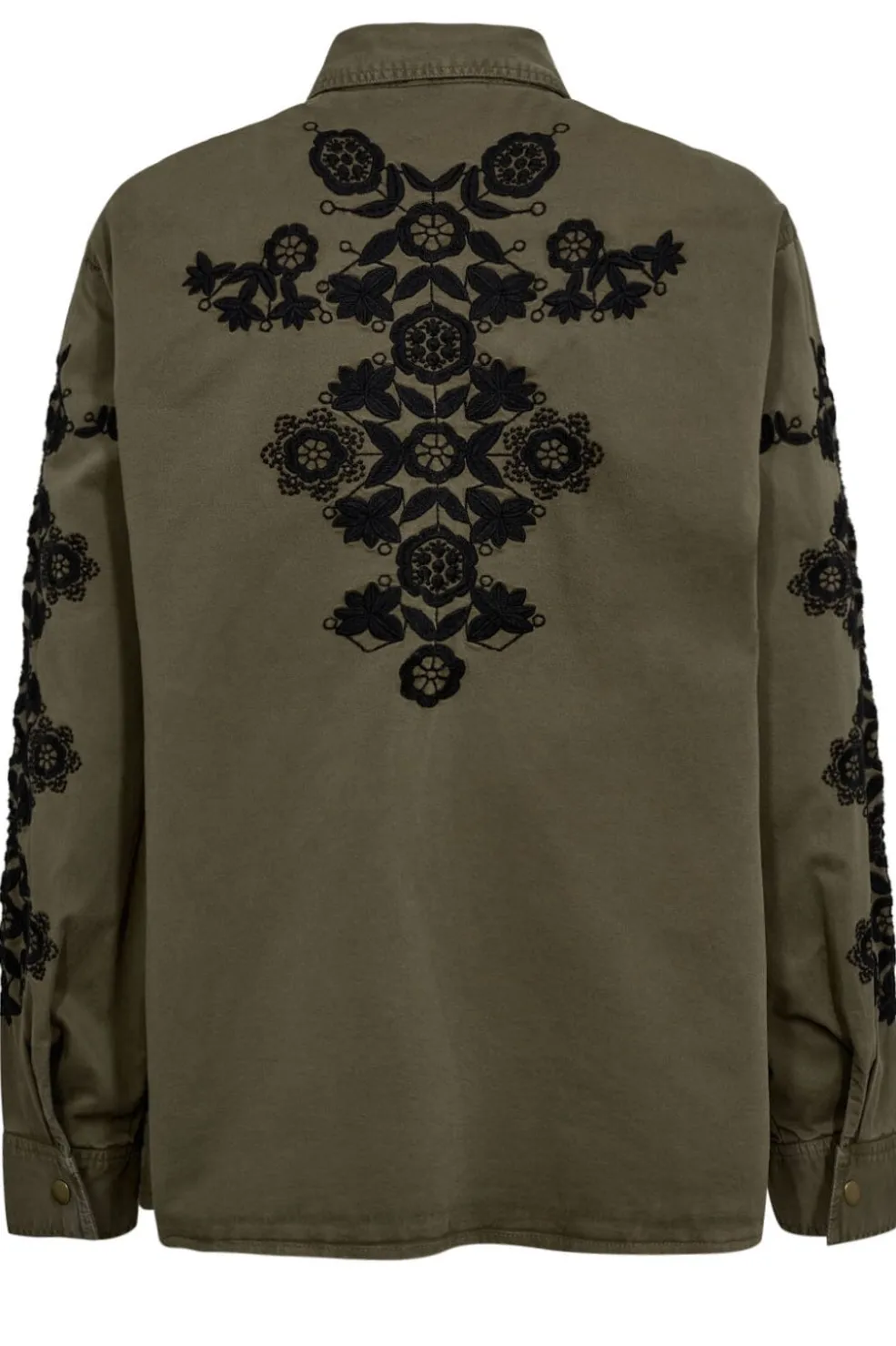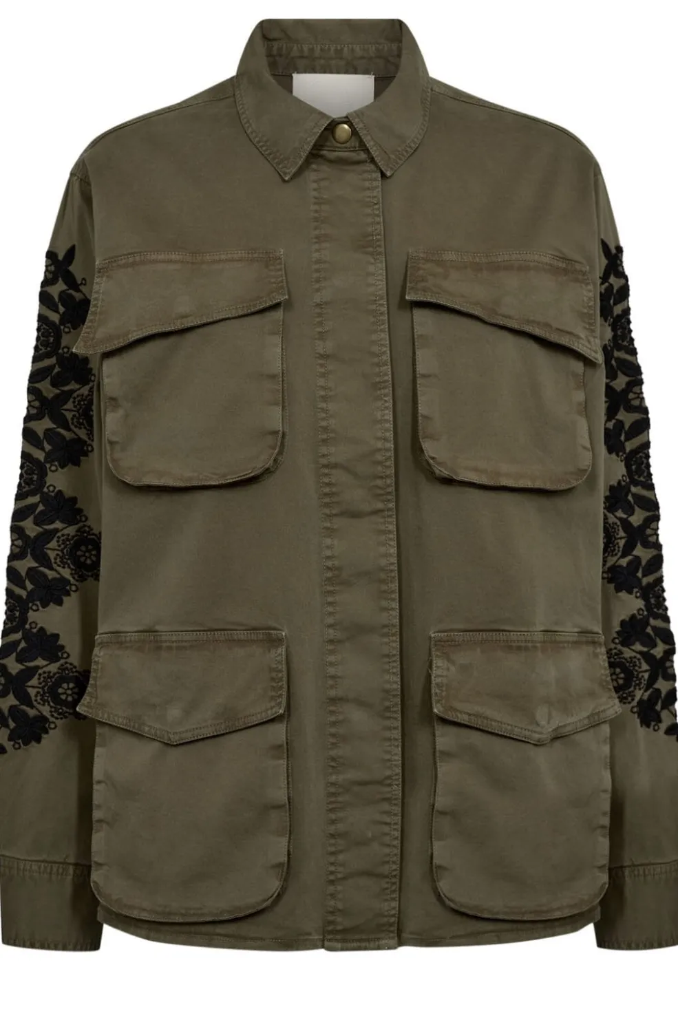 Army-jakke fra Gossia i bomuldsmateriale. Jakken har sort broderi på ærmerne og ryggen, store brystlommer og en klassisk skjortekrave med knaplukning.