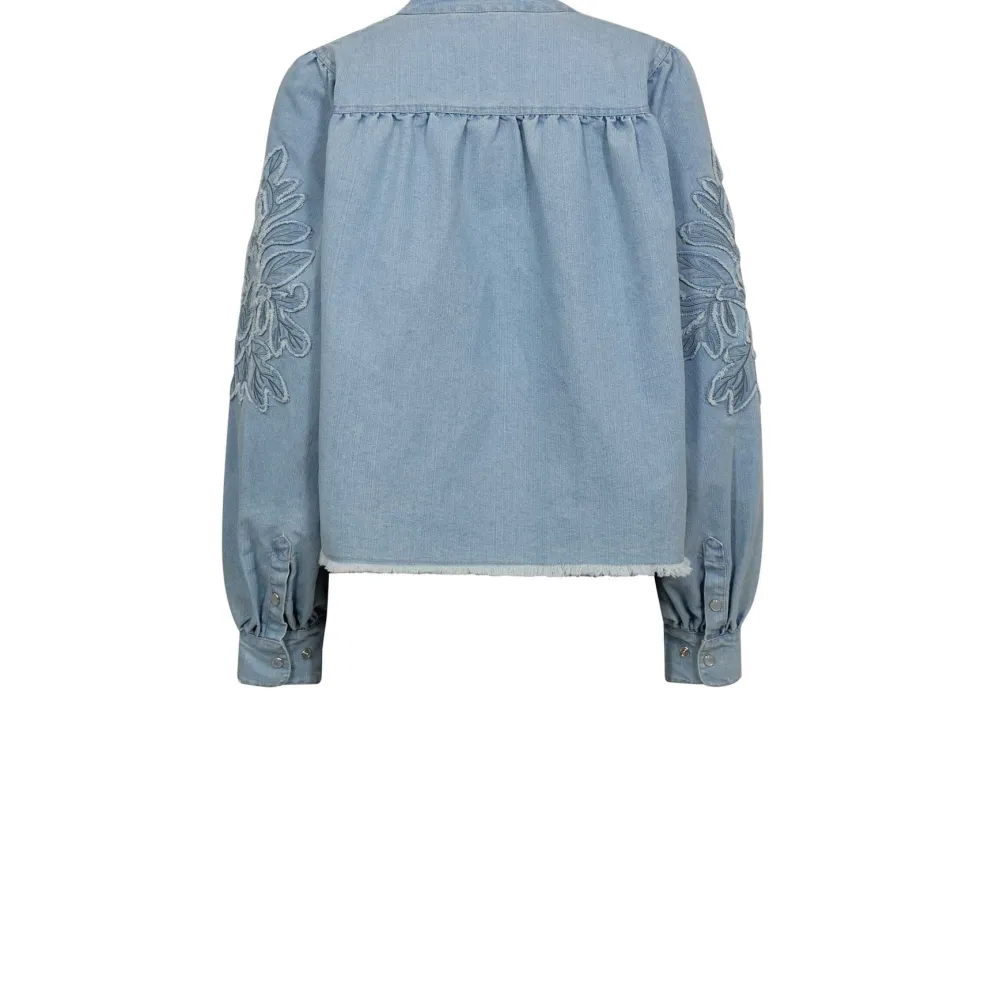 Bluse fra Gossia i lyseblå denim. Blusen har broderede blomsterdetaljer på ærmerne og en V-formet halsudskæring med frynser i bunden.