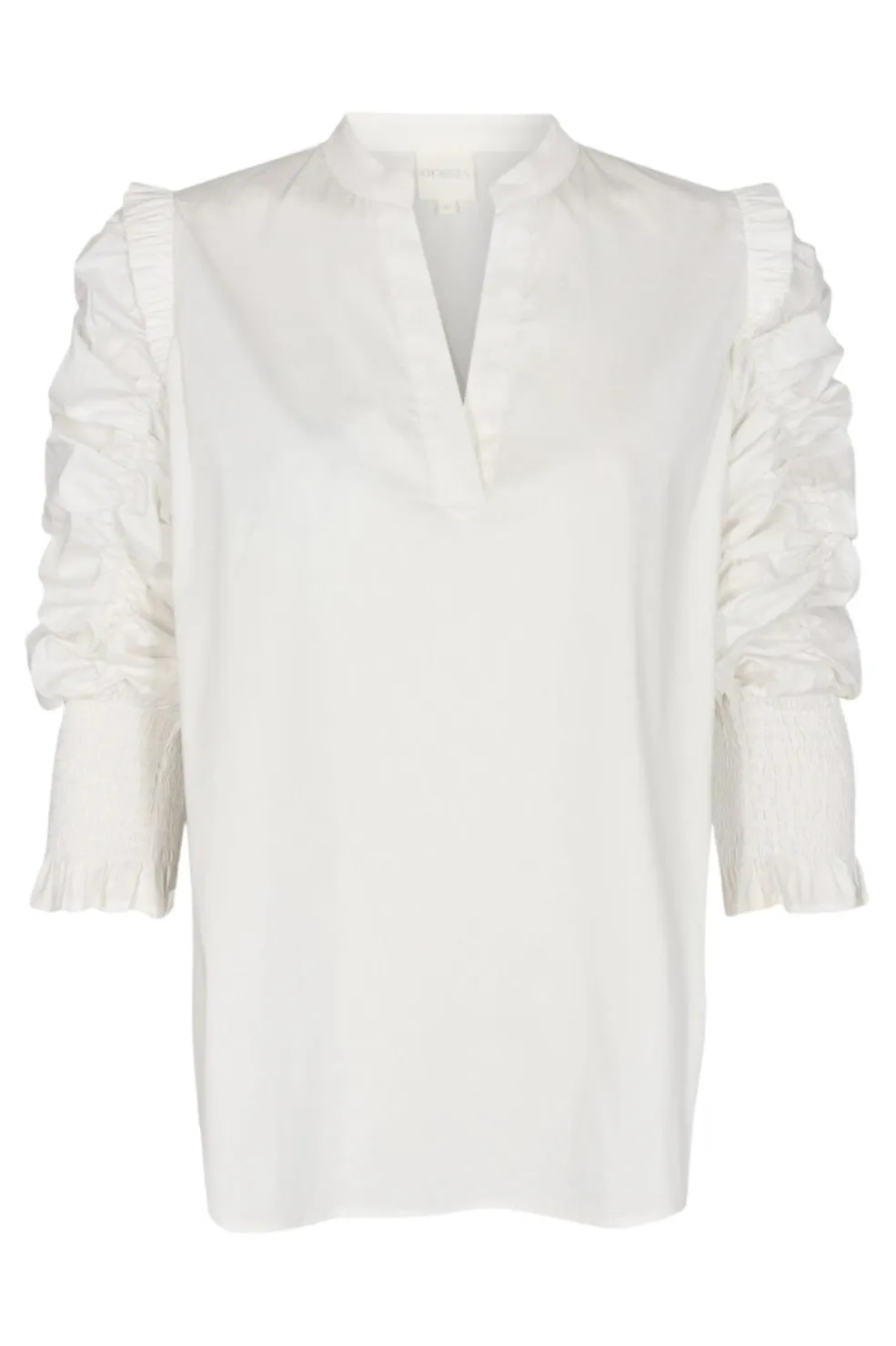 Hvid bluse fra Gossia med V-hals og flæsedetaljer. Blusen har rynkede 3/4-ærmer og en asymmetrisk kant, der er længere bagpå end foran.