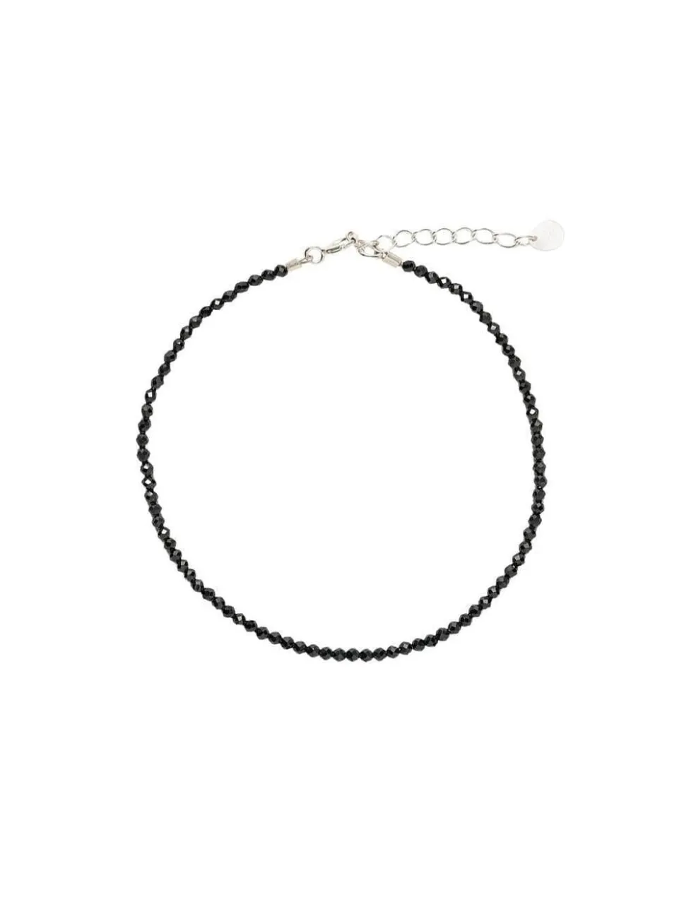 Håndlavet ankelkæde fra Sorelle Jewellery. Den er fremstillet på et dansk værksted med sort spinel og sterling sølv som hovedmaterialer.