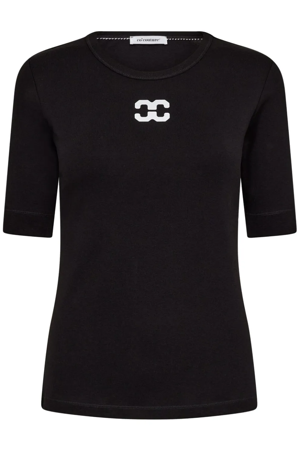 Sort t-shirt med hvidt logo på brystet. Den runde halsudskæring og de korte ærmer giver t-shirten et enkelt udtryk. Det hvide logo på forsiden skaber en god kontrast mod den sorte baggrund.