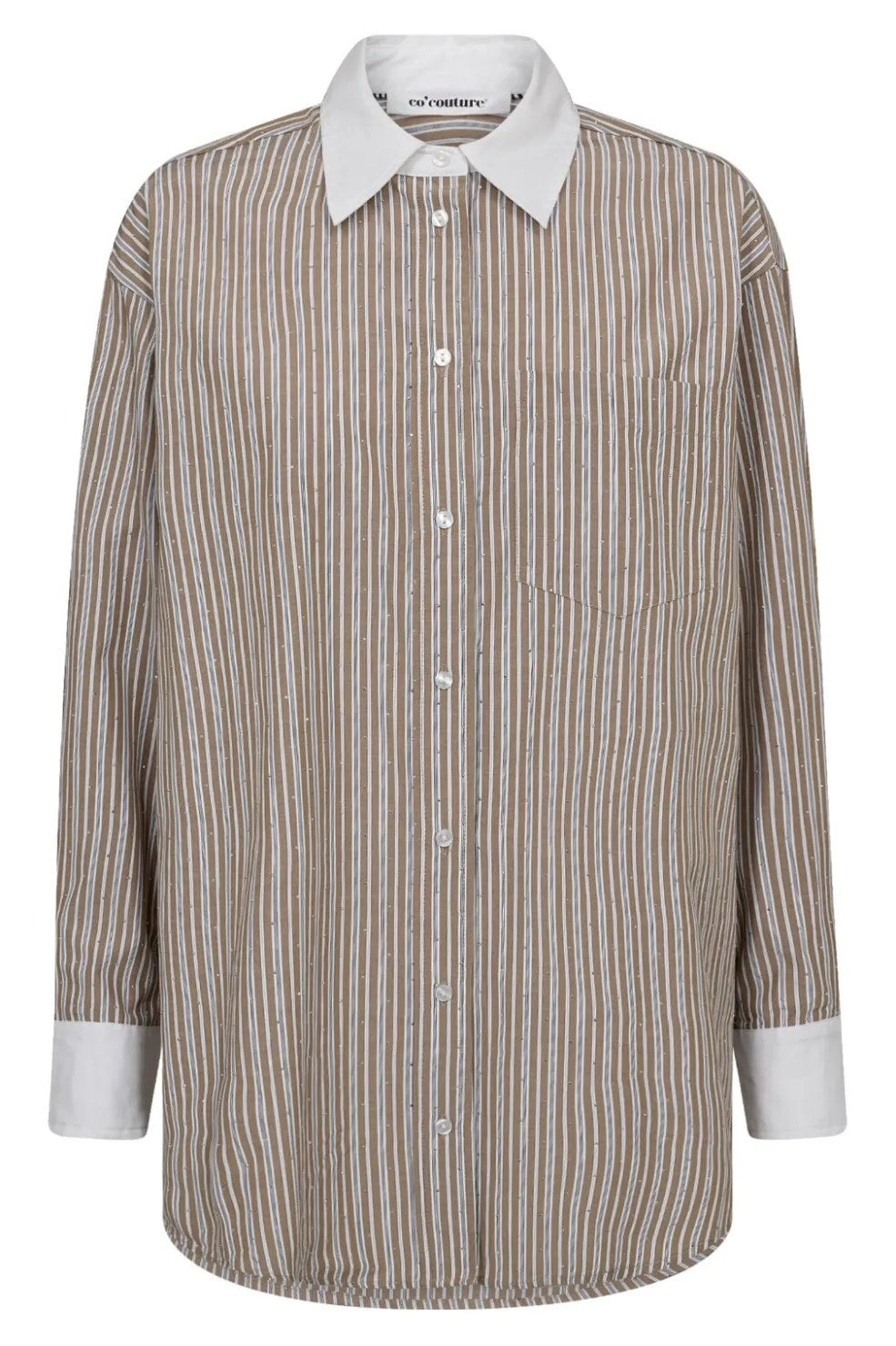 Stribet skjorte fra Co’Couture i valnøddebrun og hvid. Den har hvid krave og manchetter, som står i kontrast til de lodrette striber. En brystlomme på venstre side giver skjorten et klassisk præg.