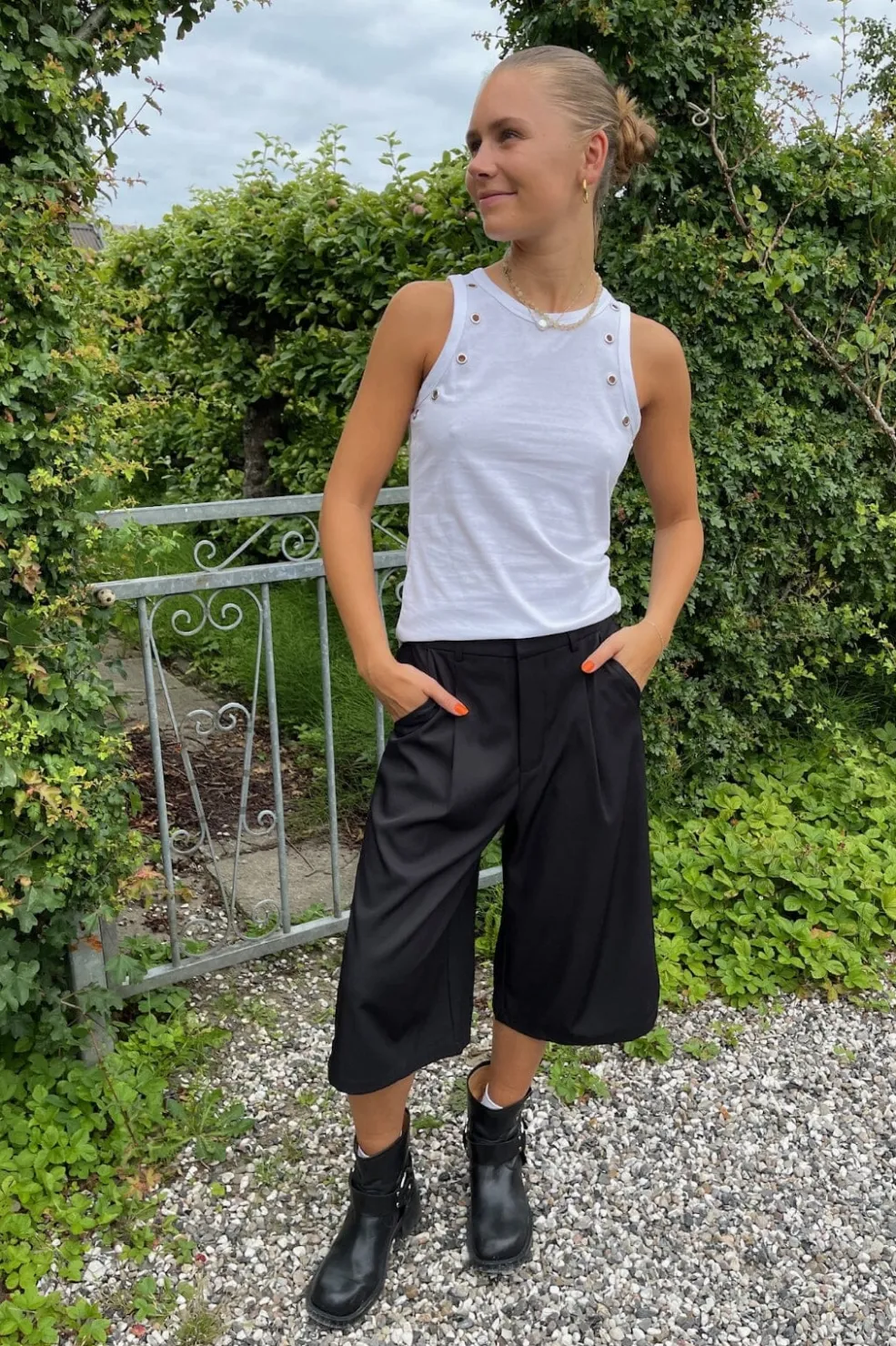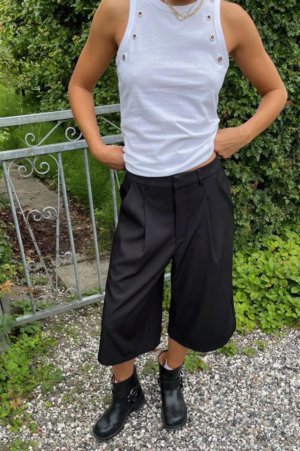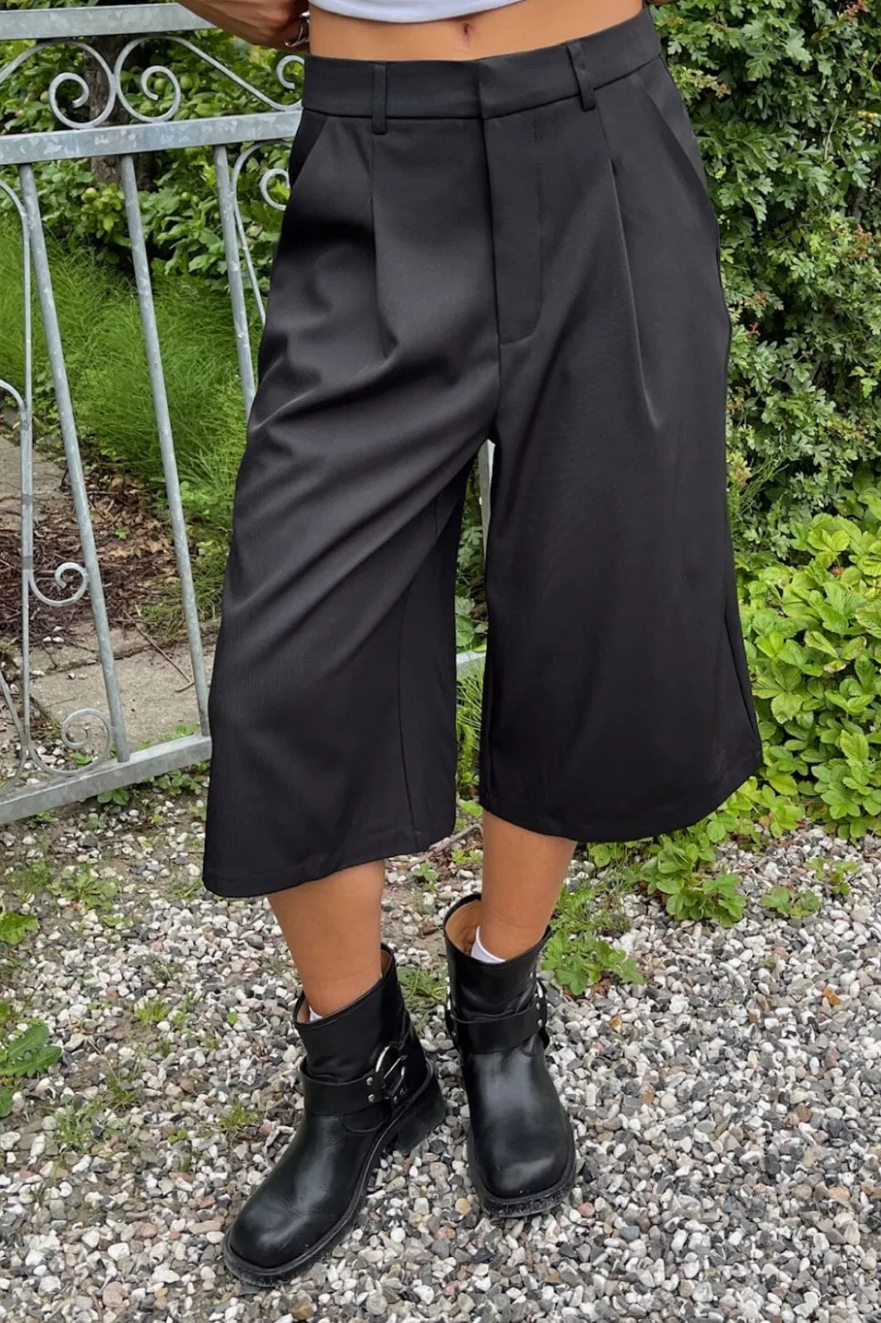 Sorte culottes fra Sisters Point med plisseringer og løs pasform. De når til midt på læggen og har høj talje med både lynlås og knapper i lukningen.