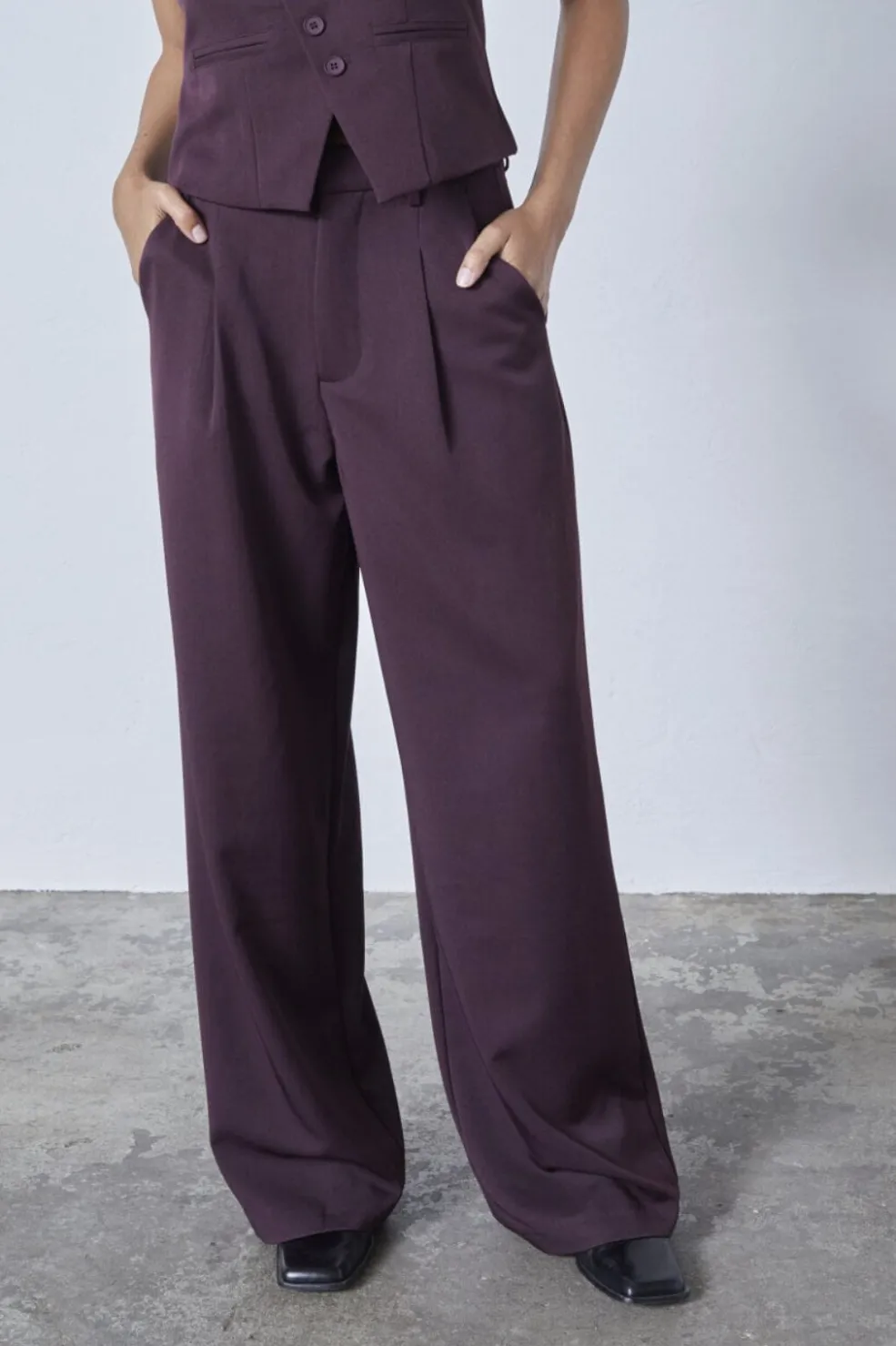Bukser fra Sisters Point i dyb bordeauxfarve. Bukserne har vide ben og en løs pasform med høj talje.