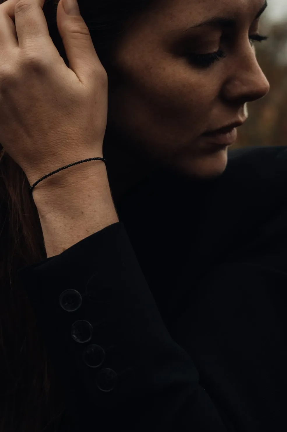 Håndlavet armbånd fra Sorelle Jewellery, fremstillet i Danmark. Sort spinel og sterling sølv kombineres i et enkelt design med justerbar længde.