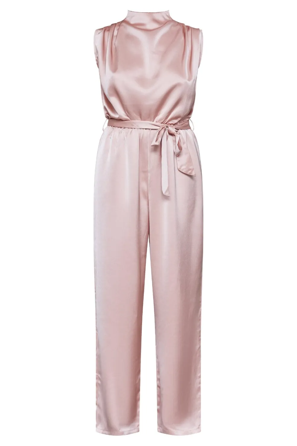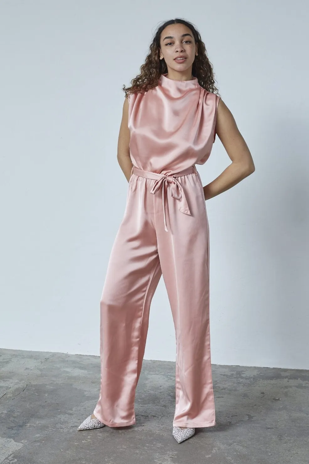 Ærmeløs jumpsuit i satin med koralrosa farve. Den har en høj halsudskæring, udskæring i ryggen og et bindebånd i taljen til at justere pasformen.